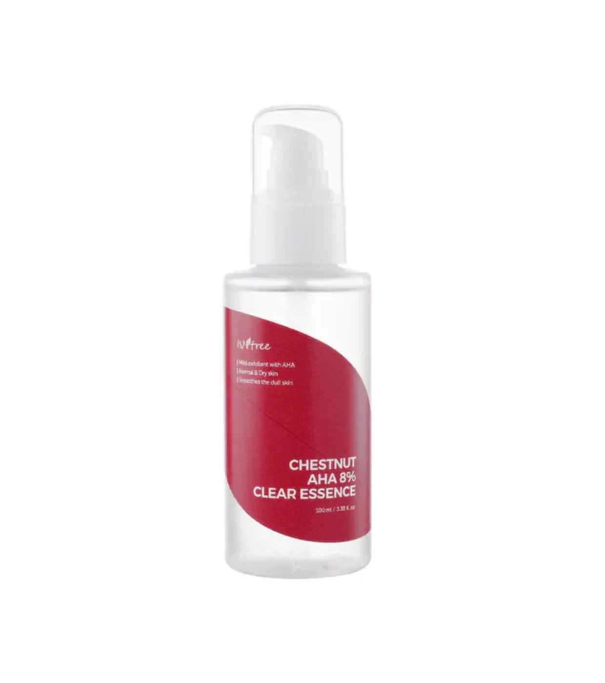 Essência Esfoliante de Ácido Glicólico e Lático ISNtree , uma essência esfoliante suave, porém eficaz, contendo 8% de AHA (4% de ácido glicólico + 4% de ácido lático) para remover células mortas da pele, desobstruir os poros e melhorar a textura da pele.