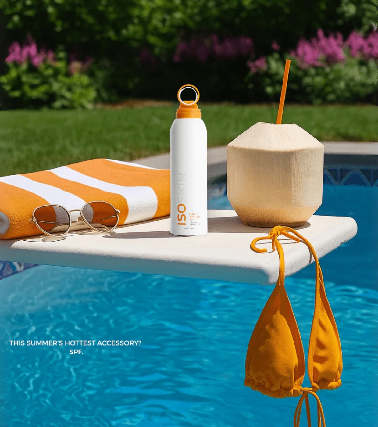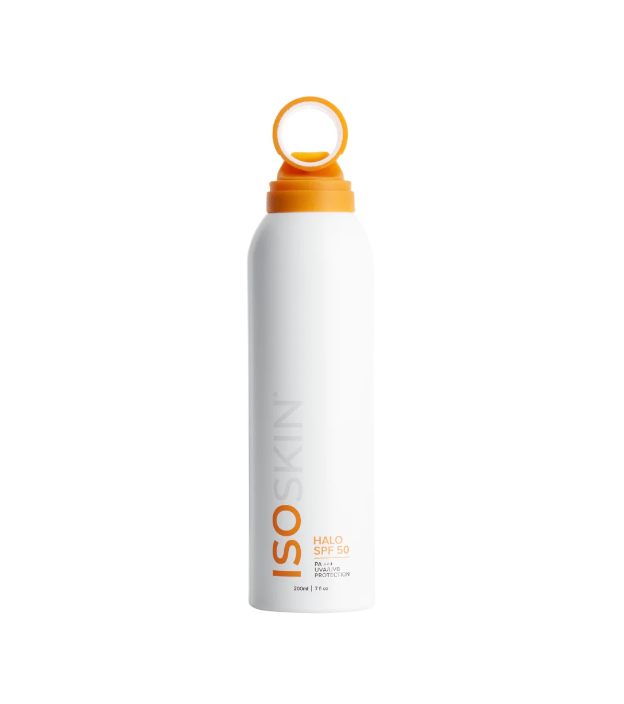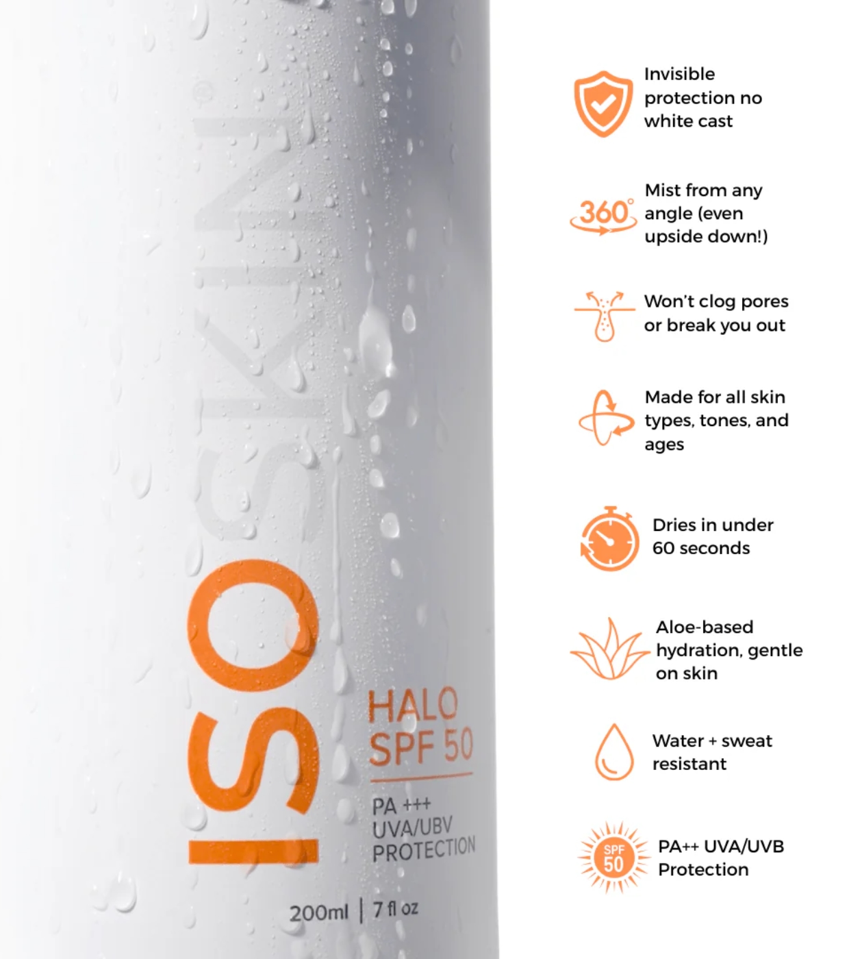 Proteja sua pele com ISOSKIN Halo FPS 50 , um protetor solar em spray leve e de secagem rápida que oferece proteção UVA/UVB eficaz com sua fórmula avançada PA+++.