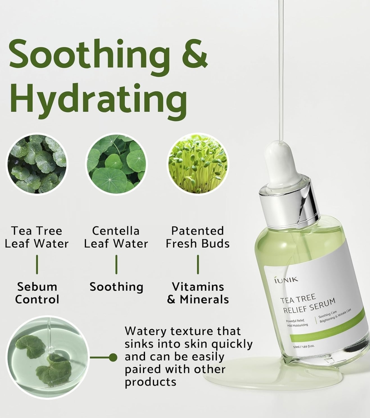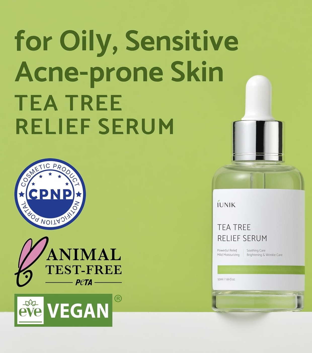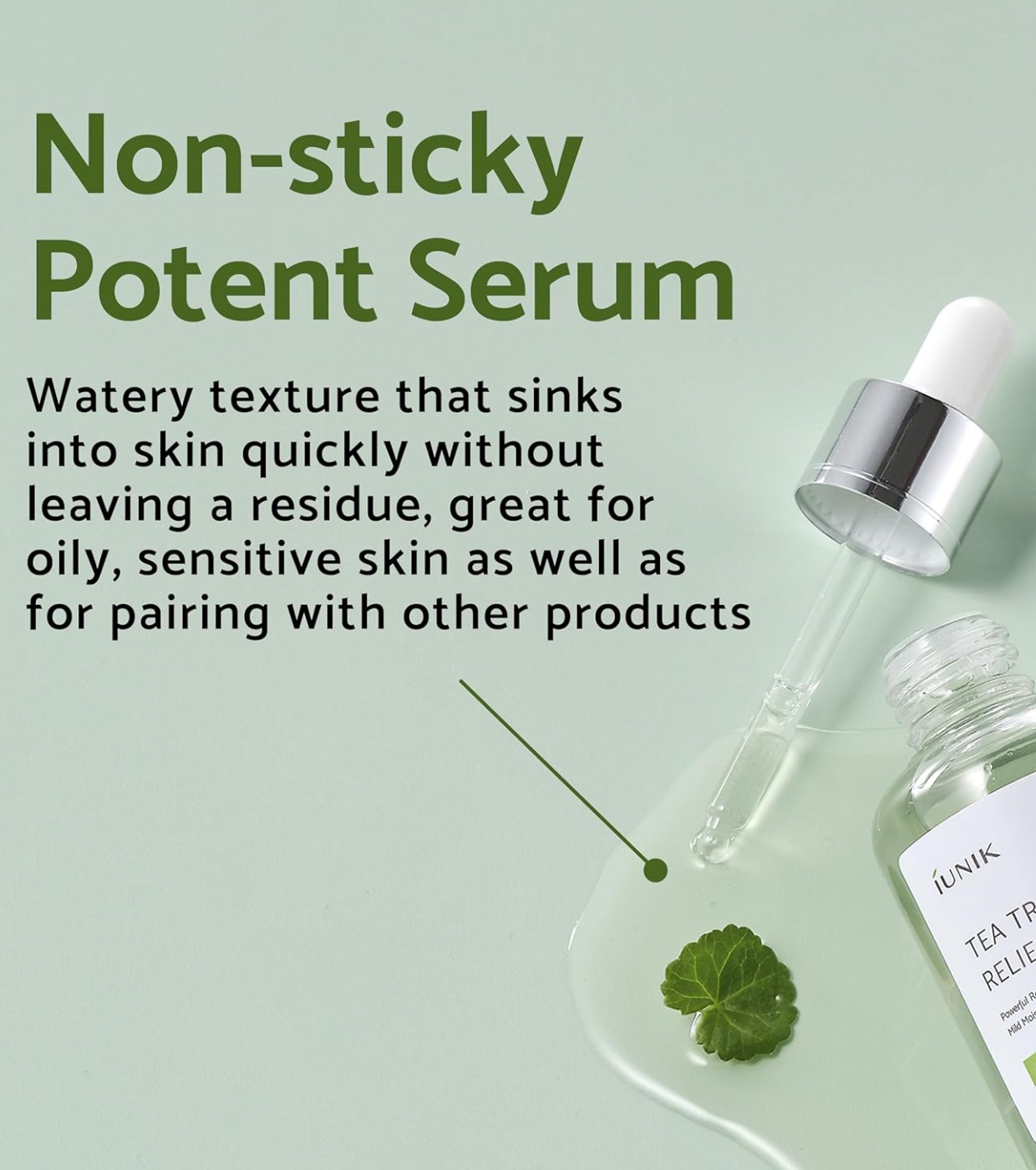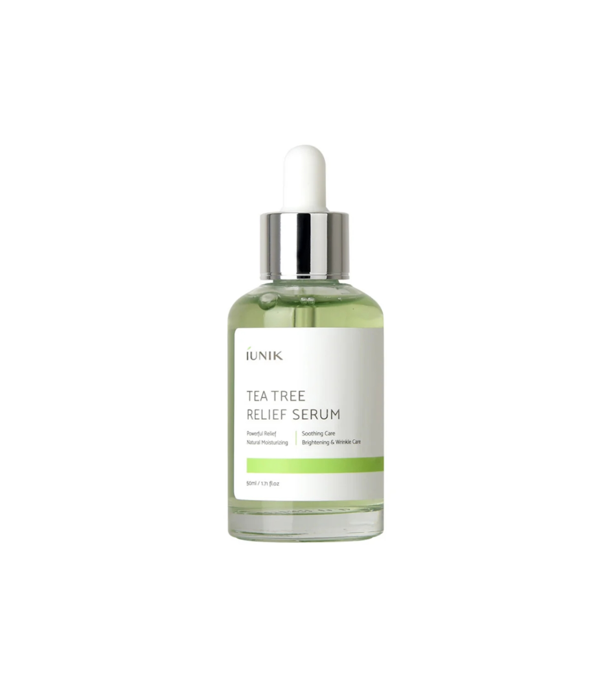 iUNIK Tea Tree Relief Serum é um sérum calmante e reparador especialmente formulado para peles sensíveis, irritadas ou propensas à acne.