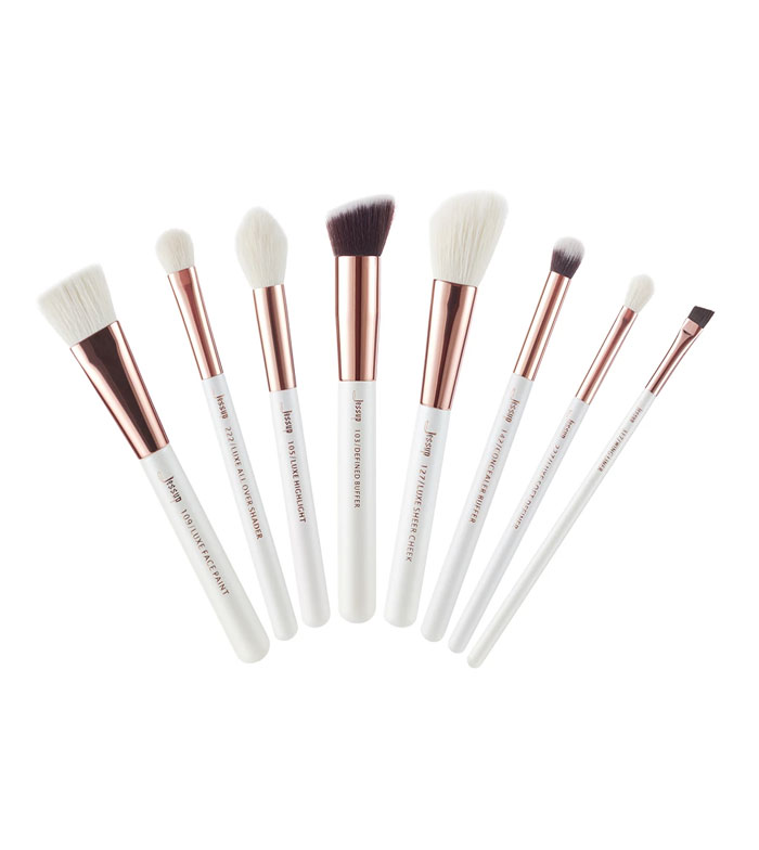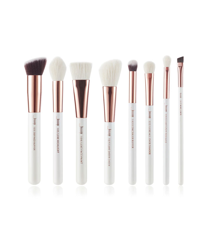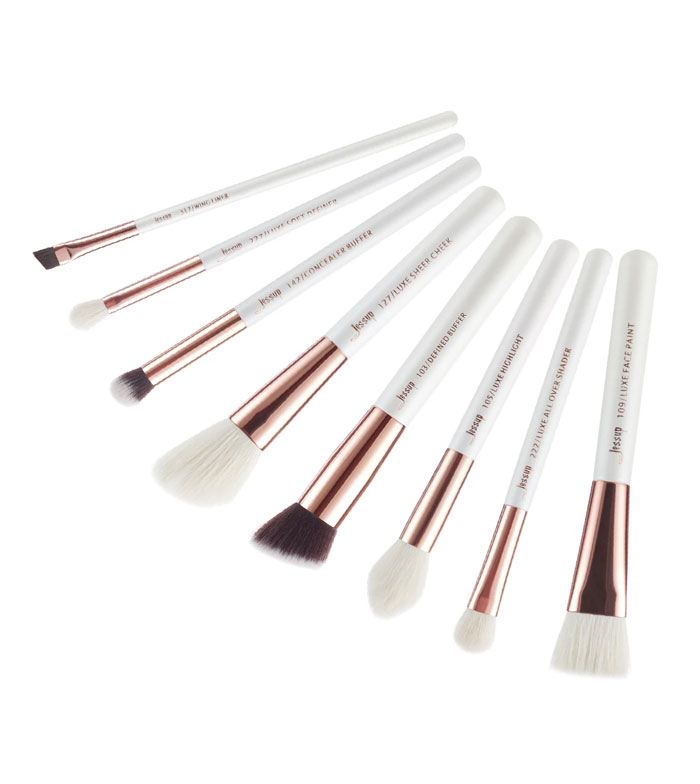 Descubra este conjunto de pincéis de 8 peças da Jessup Beauty em ouro rosa.