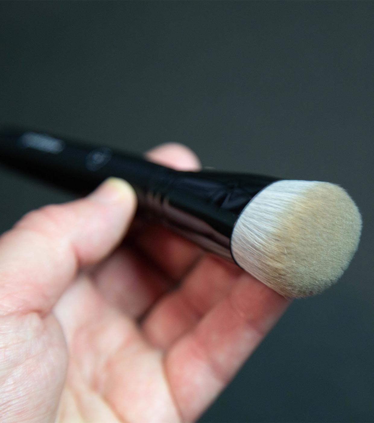 A melhor forma de aplicar a base com este pincel é primeiro bater levemente e depois esticar o produto sobre a pele, mesmo em movimentos circulares.
