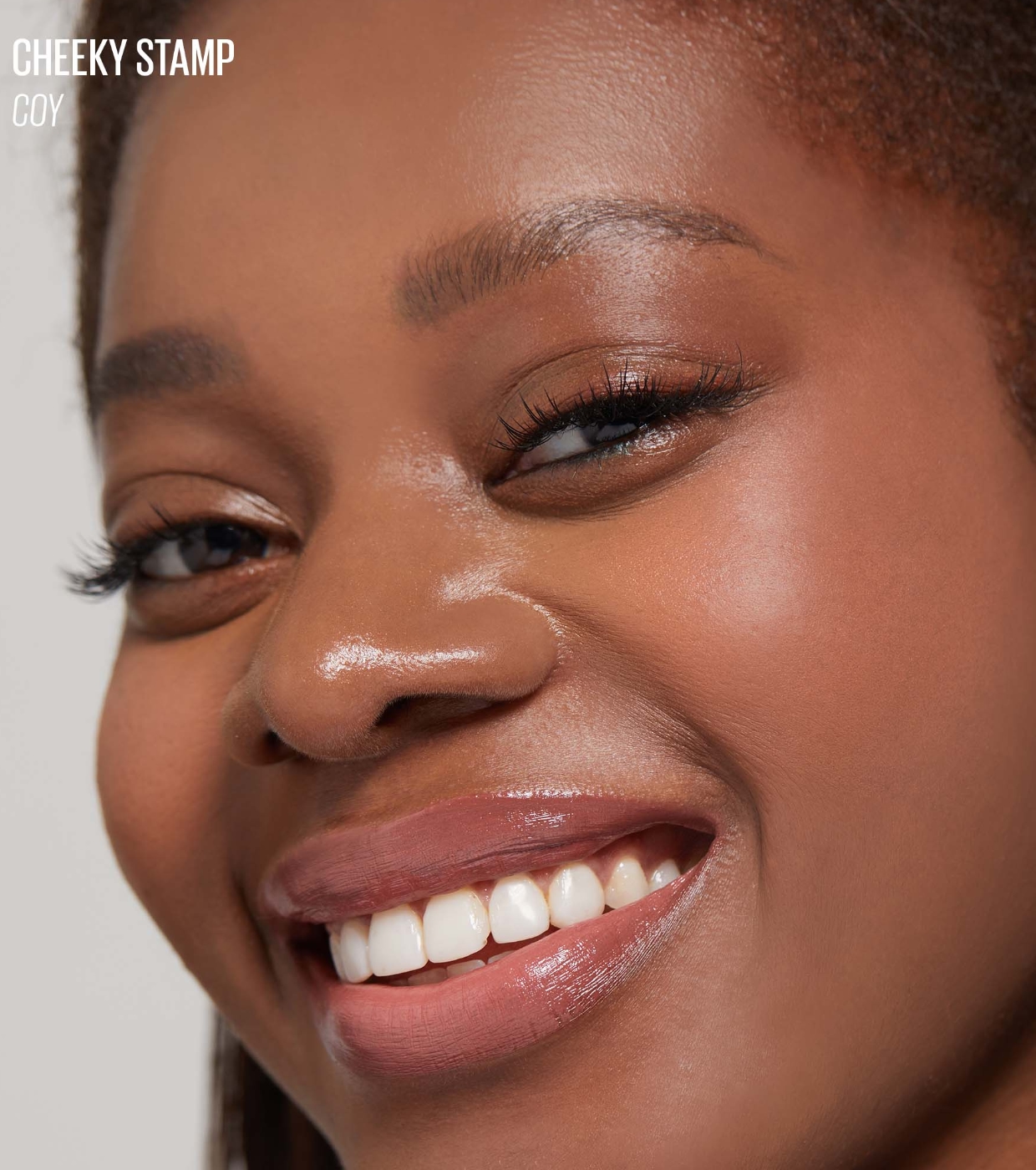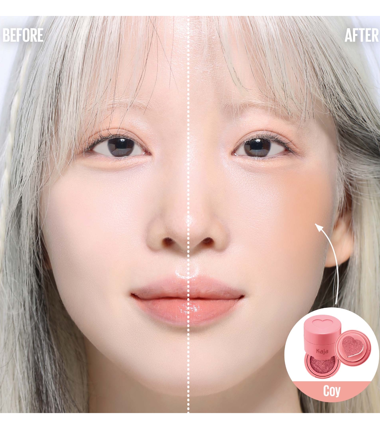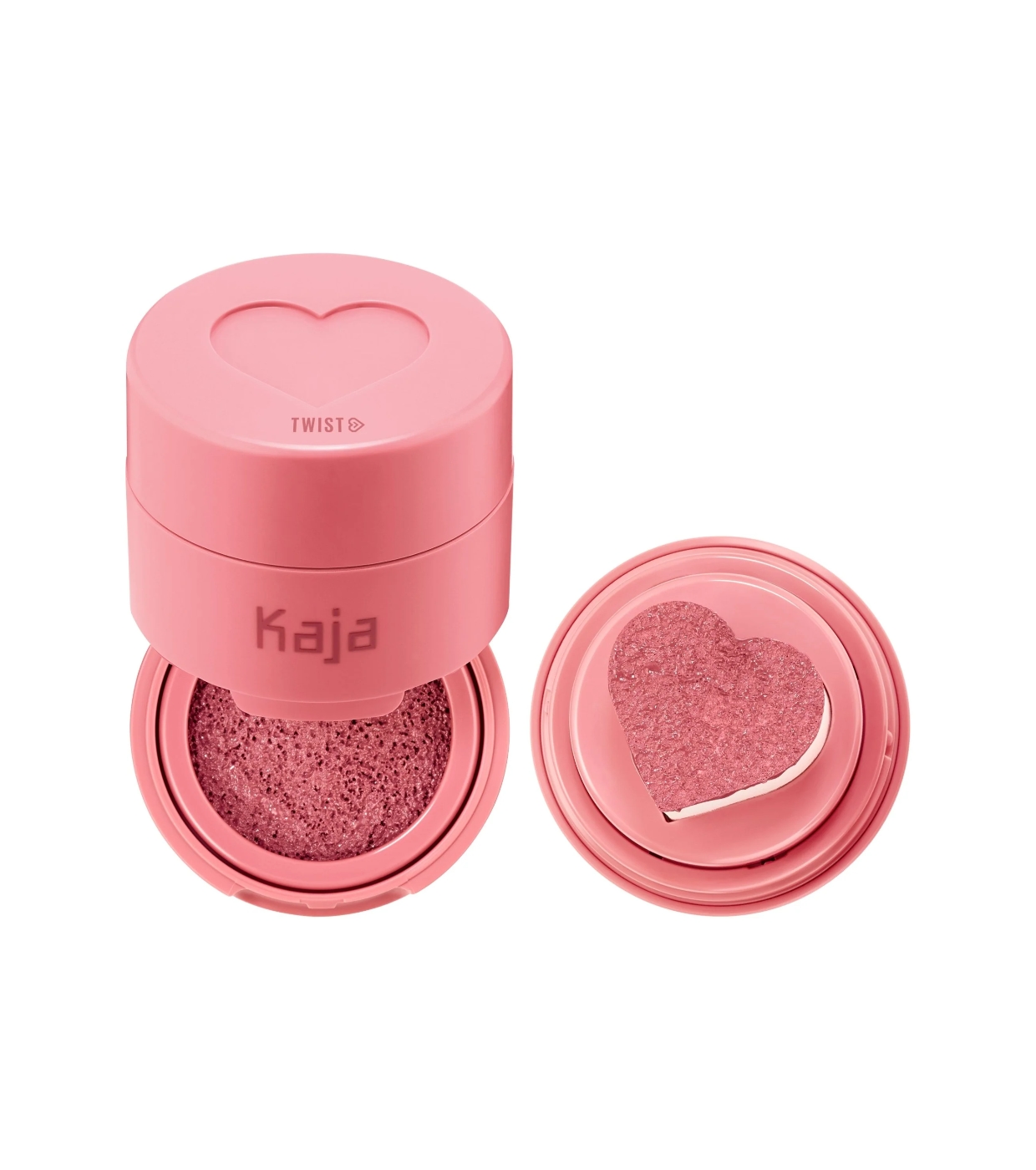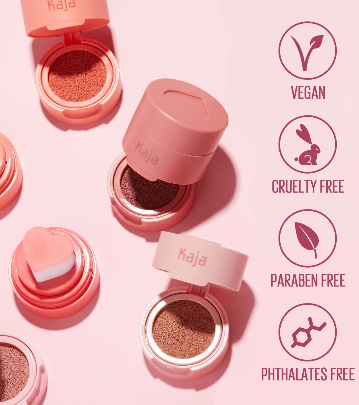 Uma fórmula de blush cushion com um aplicador em formato de coração que se mistura em um toque de cor transparente e construível é o blush cushion Cheeky Stamp da Kaja .