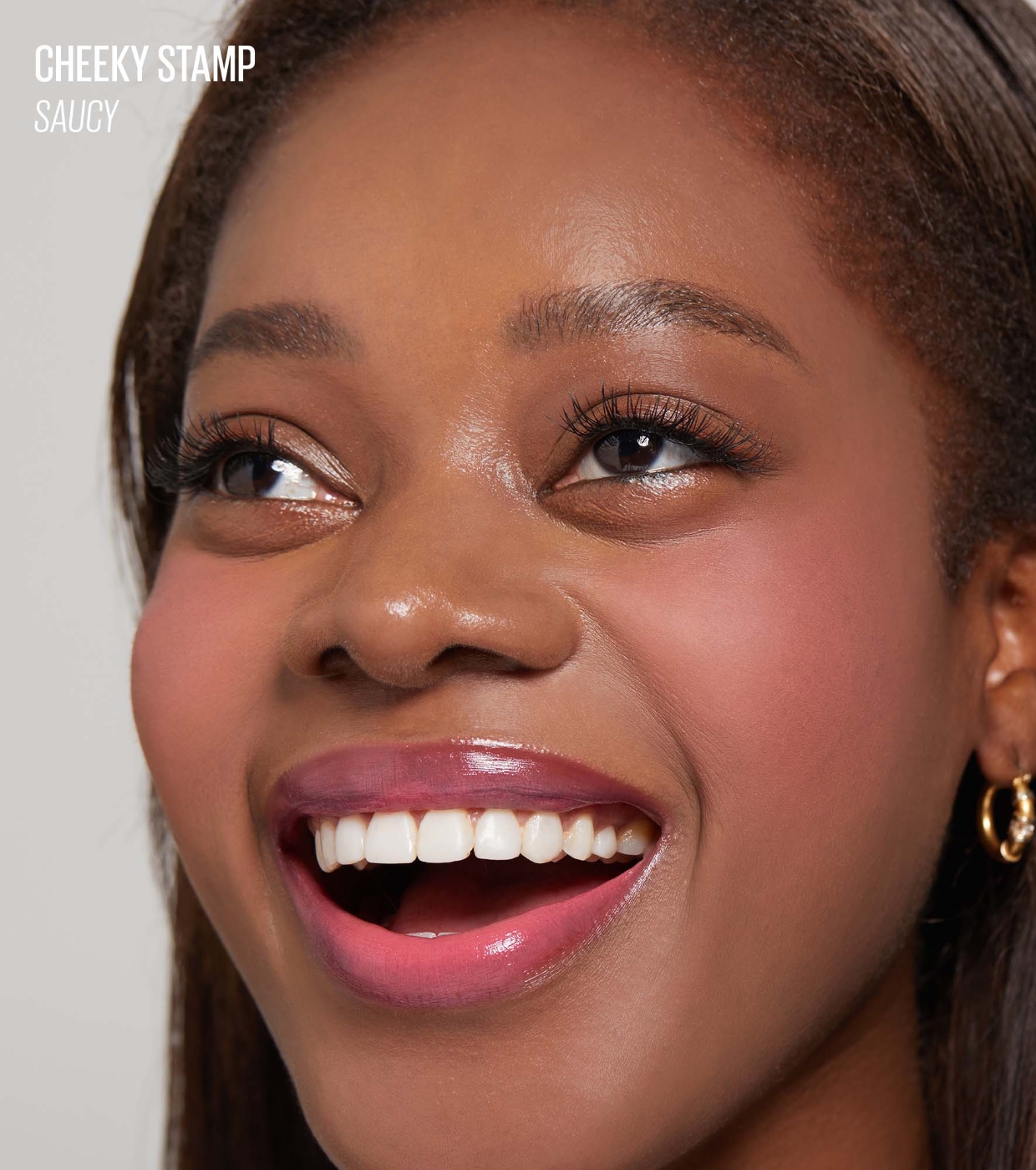 Uma fórmula de blush cushion com um aplicador em formato de coração que se mistura em um toque de cor transparente e construível é o blush cushion Cheeky Stamp da Kaja .
