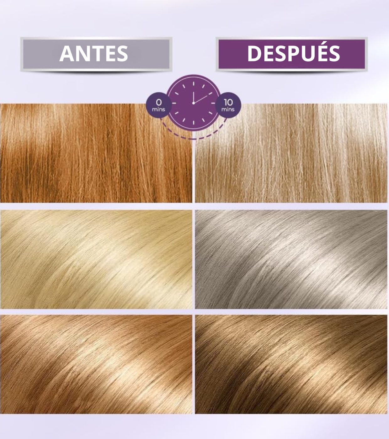 Resultado: Cabelos visivelmente mais brilhantes, com tons frios e equilibrados, sem nenhum resquício de amarelado indesejado. Ideal para conservar um loiro perfeito ou um grisalho elegante, prolongando o resultado da cor como se tivesse acabado de sair do salão.