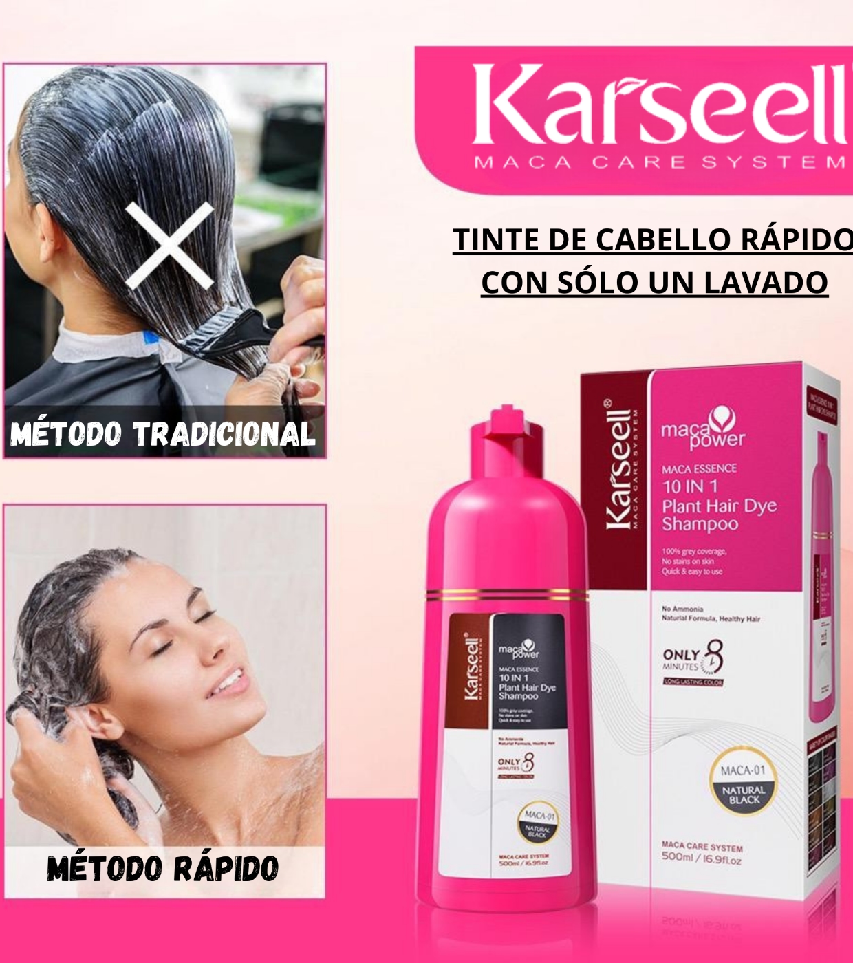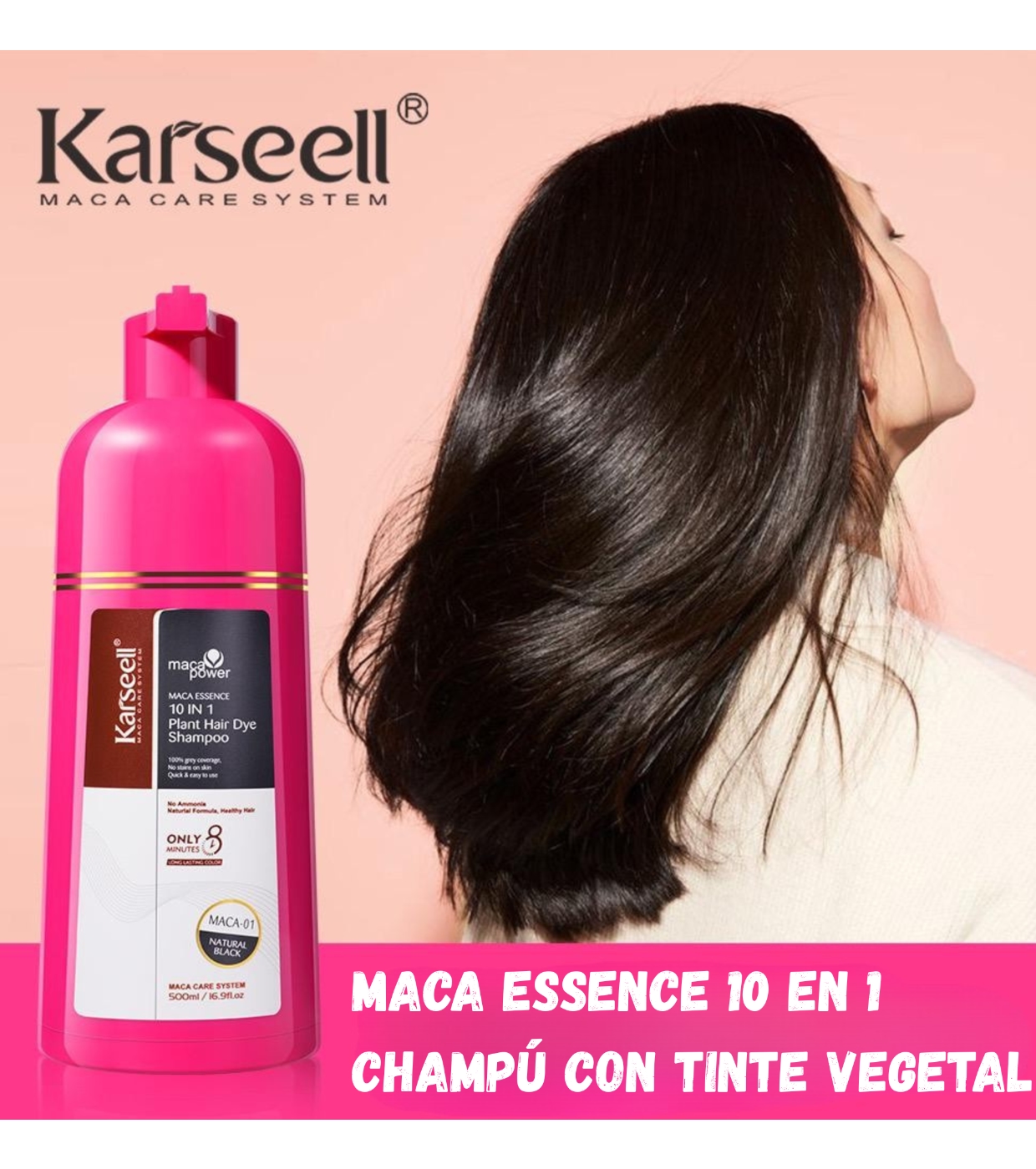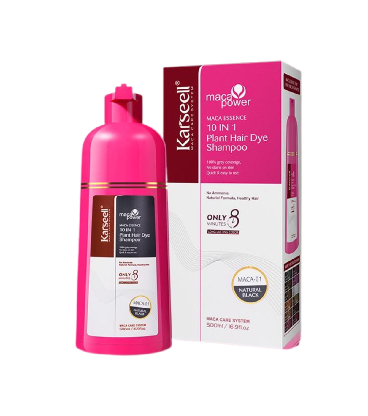 O shampoo para coloração capilar Karseell 10 em 1 cobre os cabelos grisalhos de forma rápida e natural, ao mesmo tempo que nutre e fortalece os fios.
