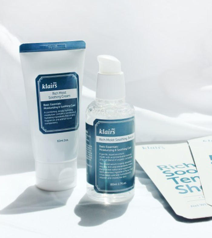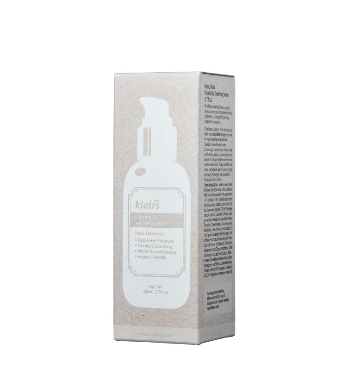 El Sérum Rich Moist Soothing Klairs hidrata profundamente a pele, além de acalmá-la e reduzir sua temperatura.