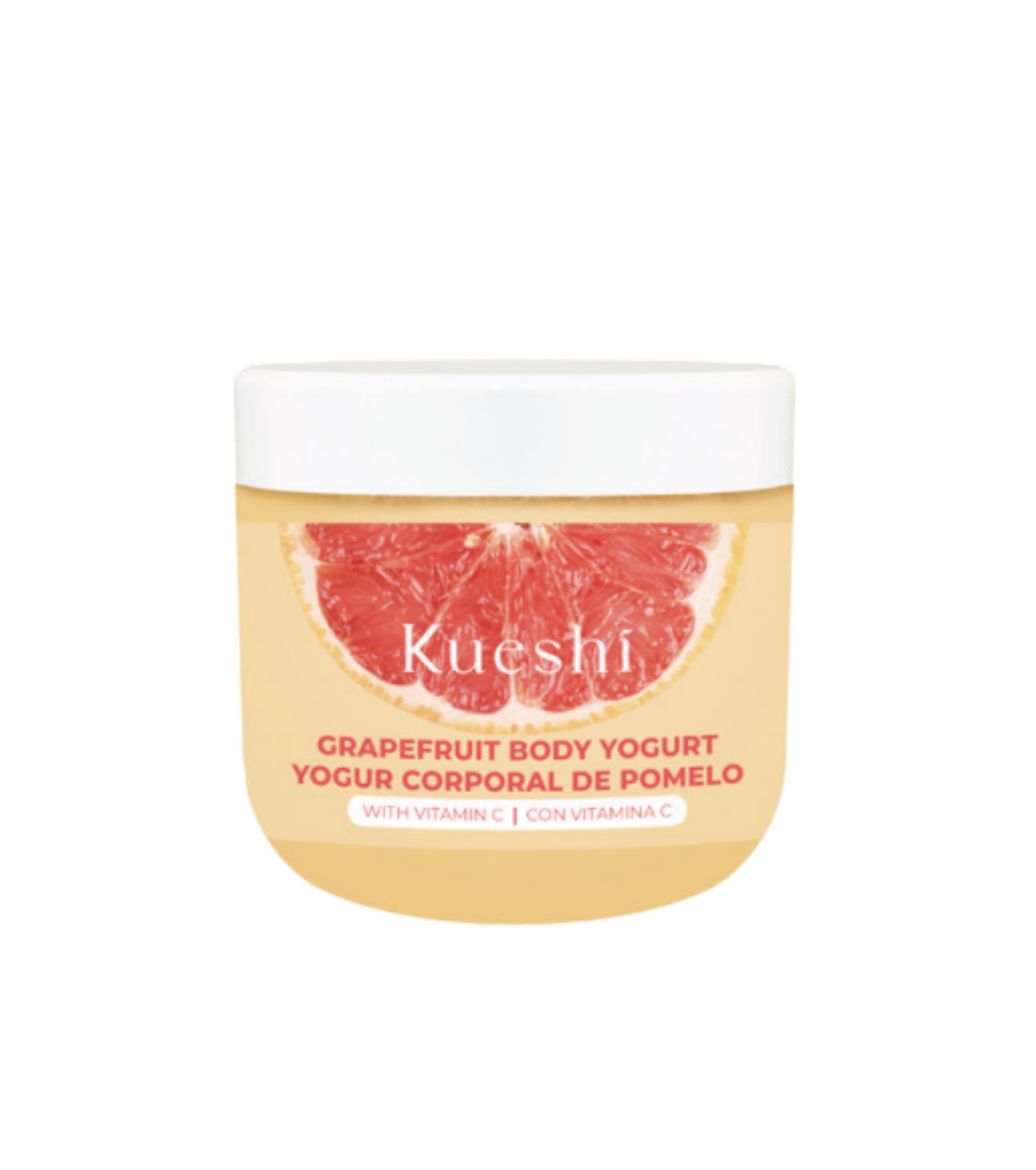 O iogurte corporal de toranja com vitamina C da Kueshi revitaliza a pele com hidratação leve e um aroma cítrico refrescante.