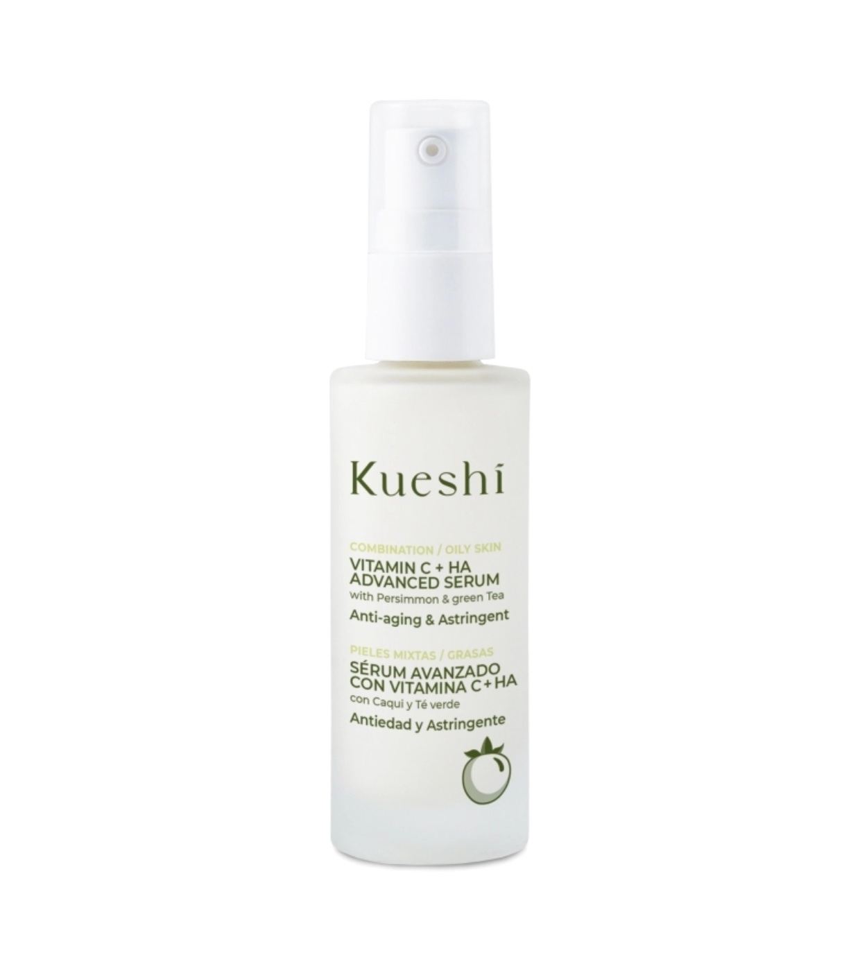 Kueshi Sérum avançado de vitamina C + ácido hialurônico (AH) , enriquecido com caqui e chá verde, especialmente desenvolvido para peles mistas e oleosas.