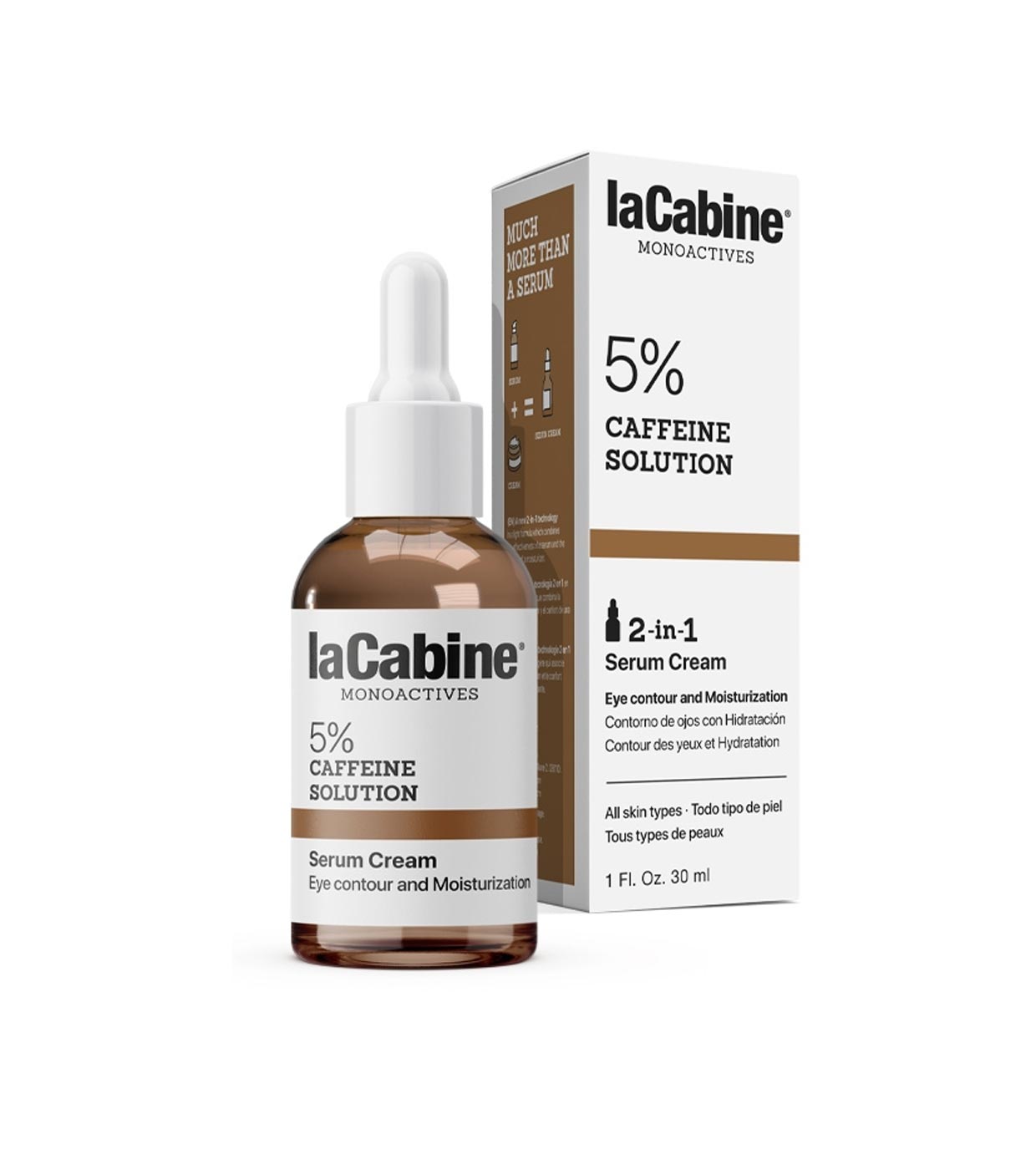 Sérum Creme 2 em 1 com 5% de cafeína em solução, ajuda a reduzir bolsas e olheiras ao mesmo tempo que hidrata.