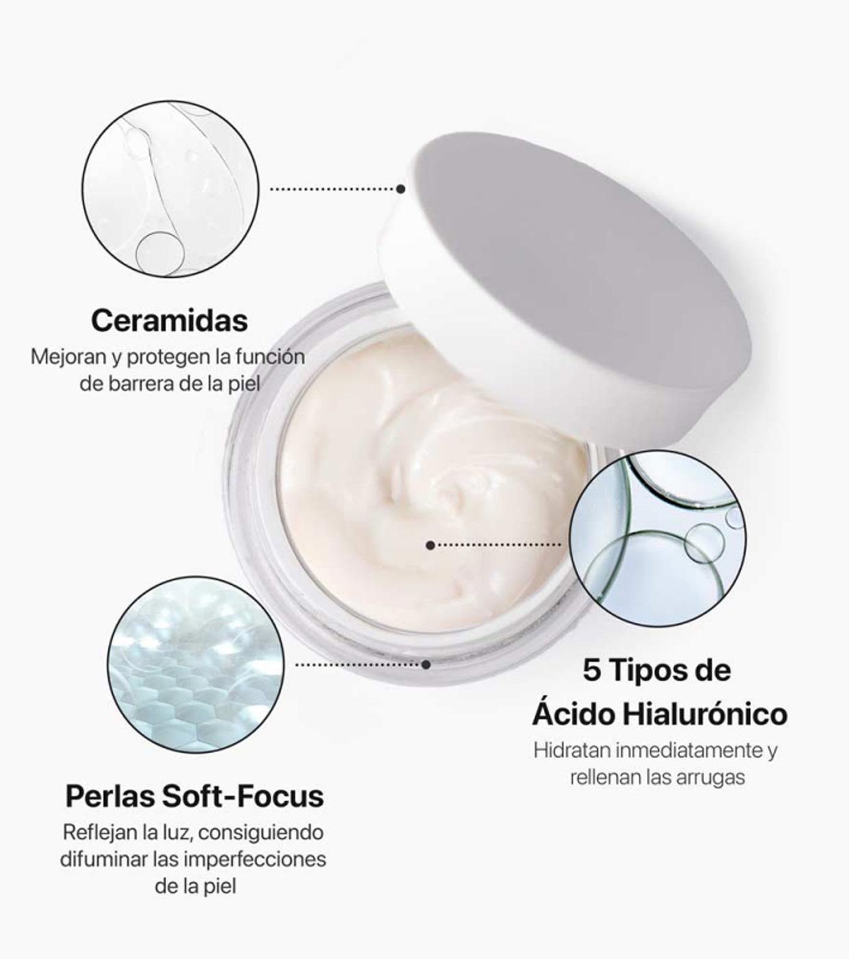 Uma fórmula única com cinco tipos de Ácido Hialurônico de diferentes pesos moleculares (alto, médio e baixo), Ceramidas, Esqualano, Pérolas Soft-Focus e Escudo Antipoluição.