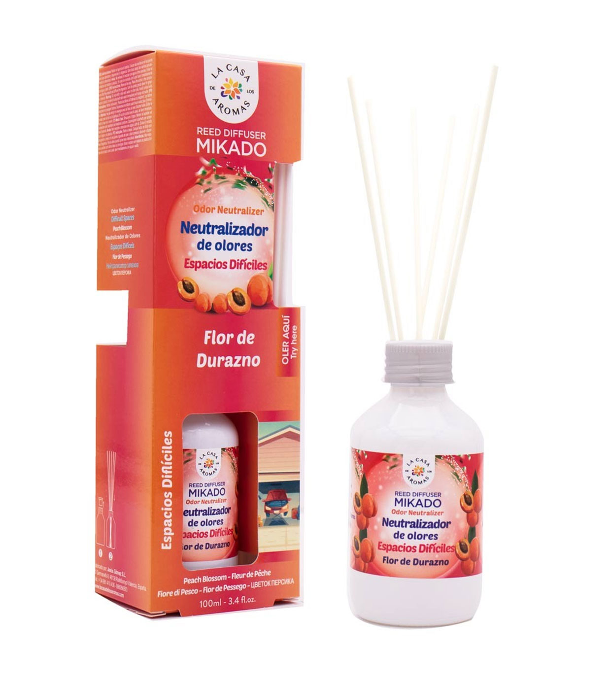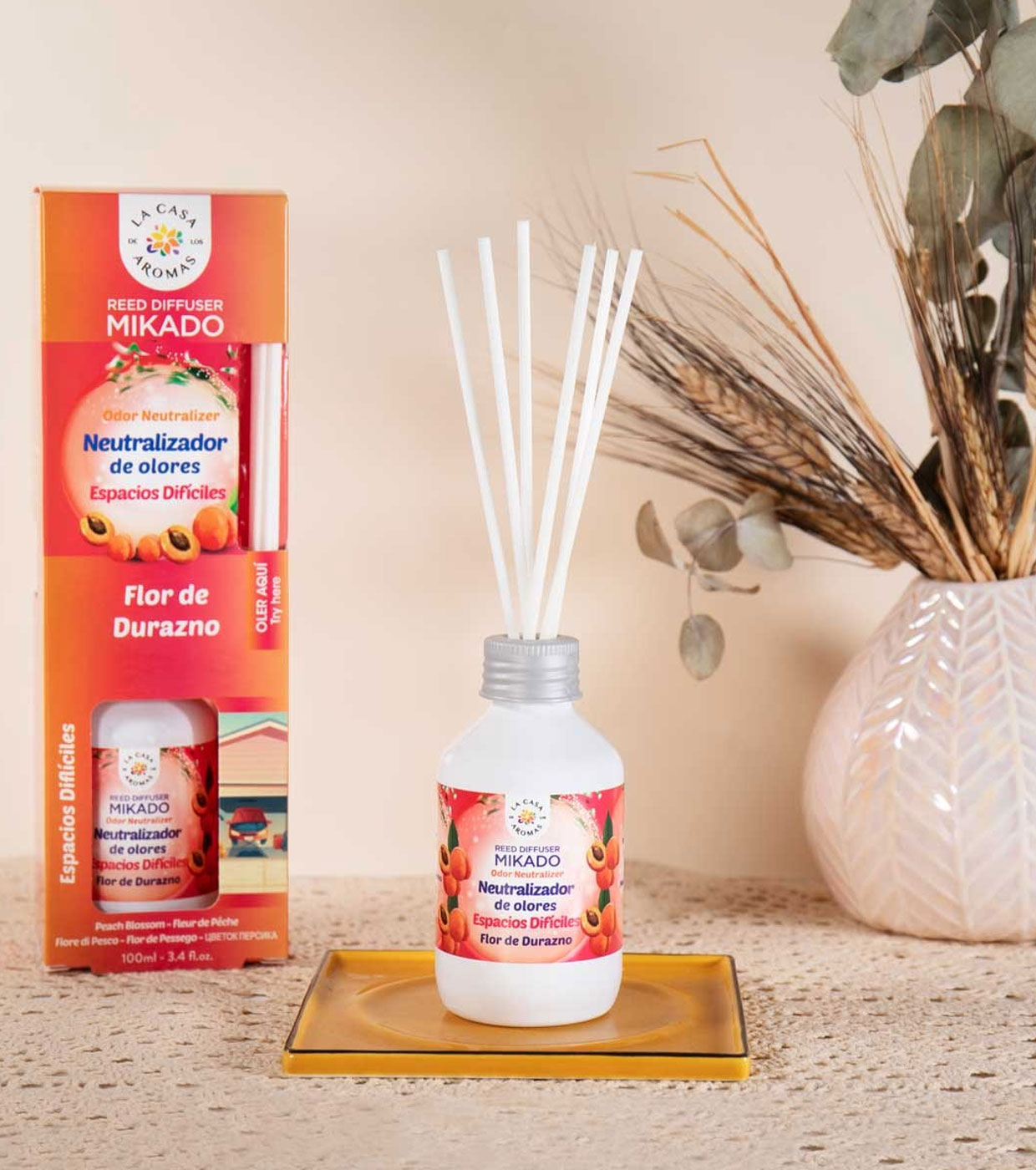 Ambientador mikado Flor de Pessegueiro da La Casa de los Aromas que ajuda a eliminar os maus odores e mantém a sua casa perfumada e protegida.