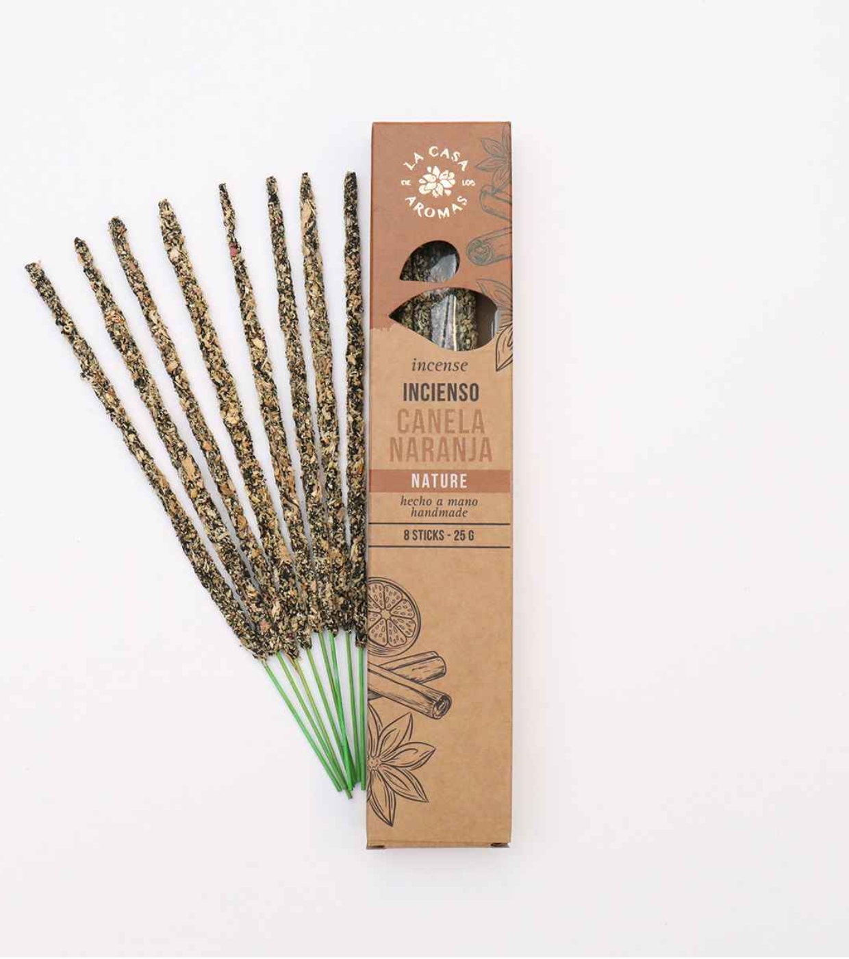 Deixe-se envolver por um turbilhão quente e picante, onde a intensidade da canela se funde com a frescura cintilante da laranja com este incenso de Canela e Laranja da La Casa de los Aromas .