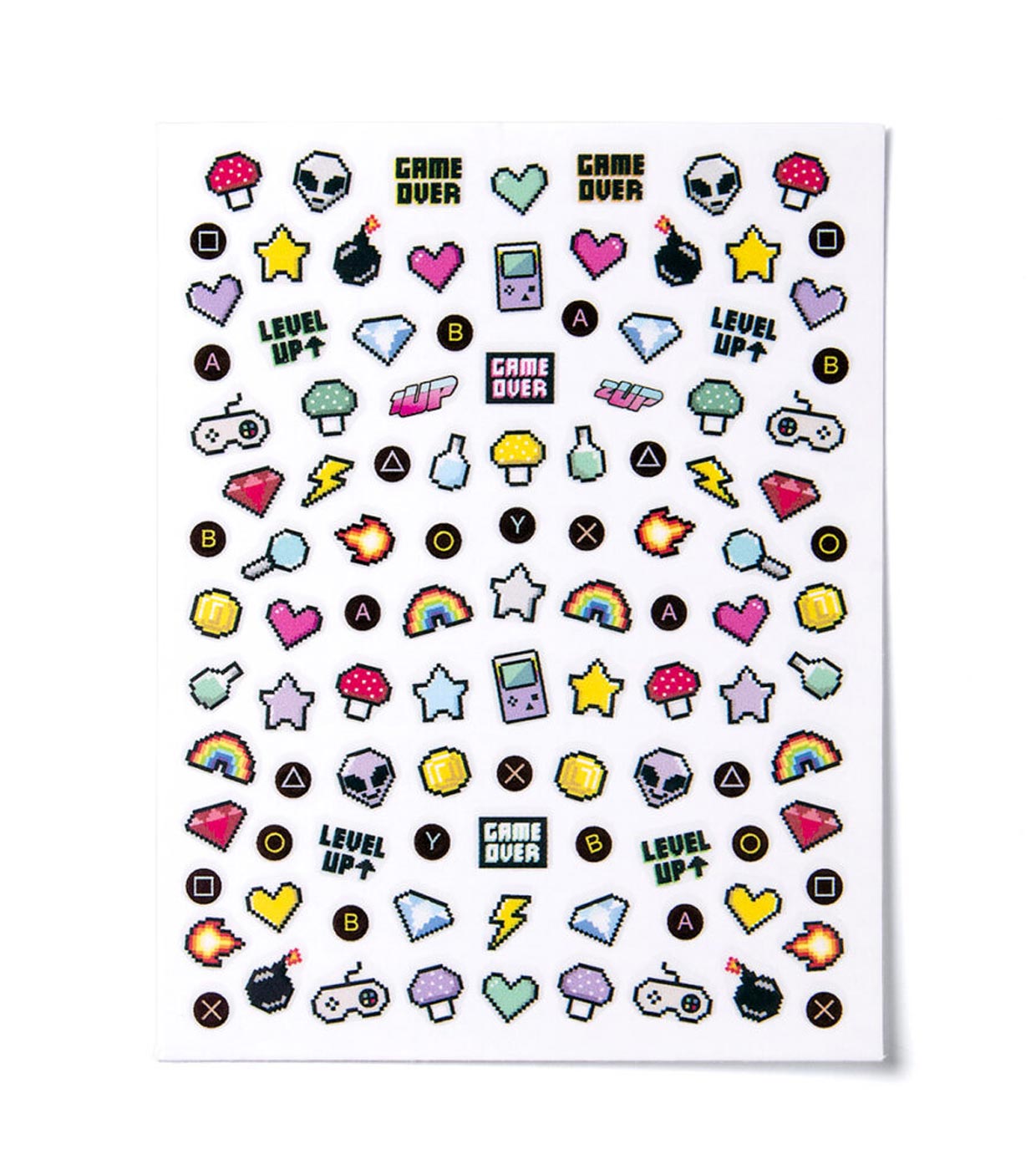 Contém 107 adesivos de unhas fofos em estilo retrô pixel art.