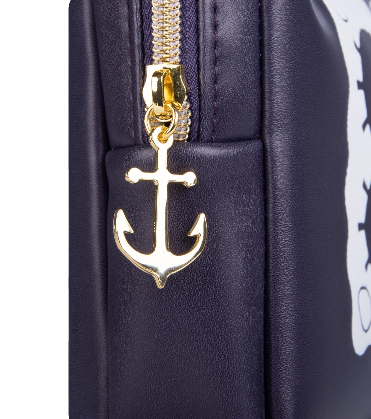 O puxador de zíper dourado em formato de âncora adiciona um toque náutico, enquanto o forro de cetim azul com estampa do Bob Esponja mantém sua maquiagem organizada em um autêntico estilo subaquático.