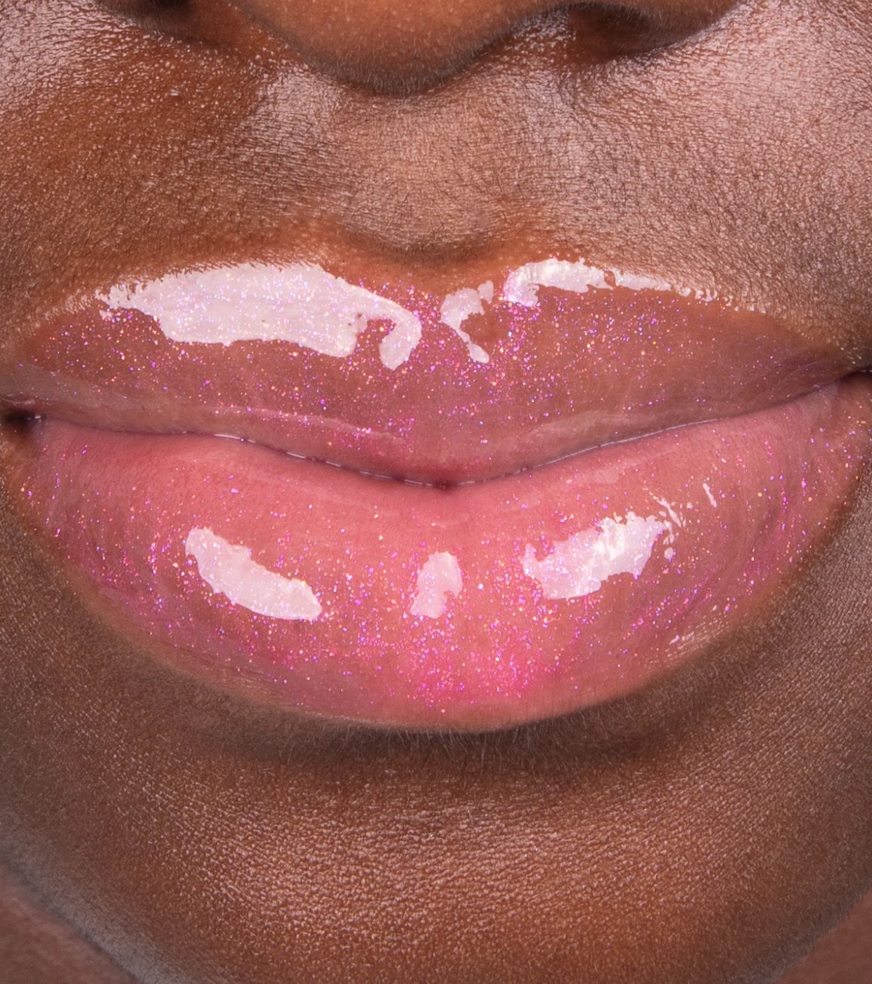 Um gloss labial da Lethal Cosmetics com sabor de geleia de água-viva, apresentando um delicado tom rosa translúcido e brilhos cintilantes em tons de roxo e rosa.