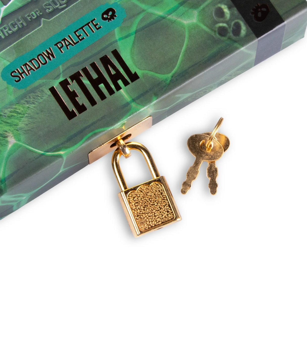 A paleta The SpongeBob Movie da Lethal Cosmetics vem em um design inspirado em um baú do tesouro, com detalhes de tábuas de madeira, o logotipo oficial do filme, rebites em formato de caveira e um fecho físico que a torna ainda mais especial.