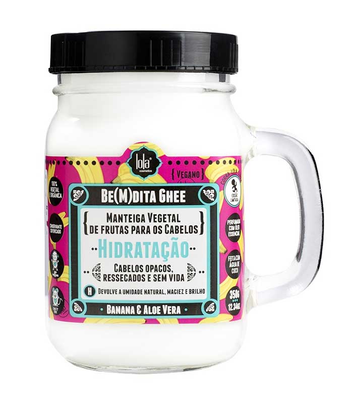 Máscara hidratante de banana e aloe vera Be(m)dita Ghee especialmente indicada para cabelos secos e sem brilho.