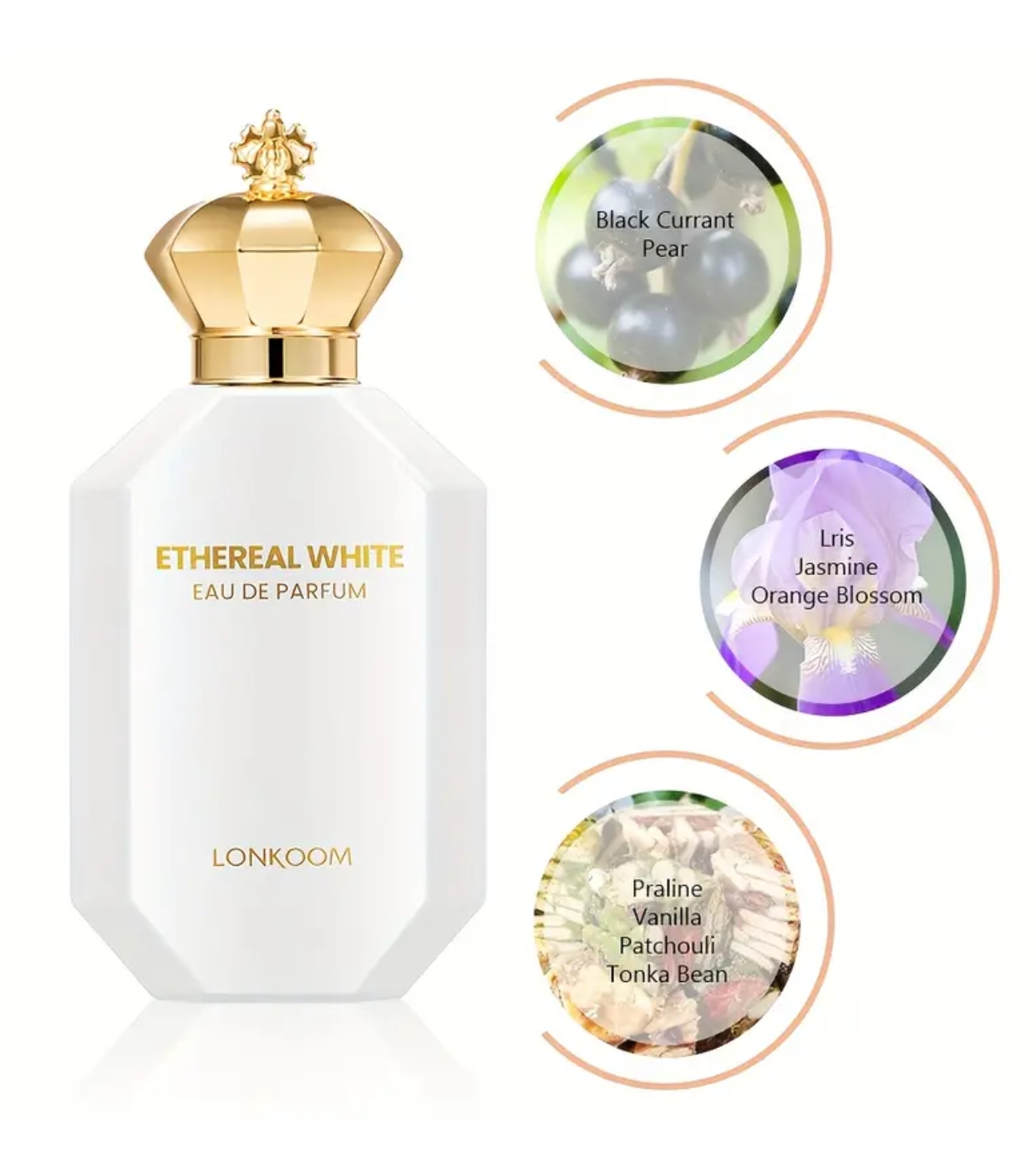 Deixe-se envolver pela delicadeza do perfume LONKOOM Ethereal White , uma fragrância feminina que captura a essência da pureza e da sensualidade com um equilíbrio harmonioso de notas florais, frescas e levemente almiscaradas.