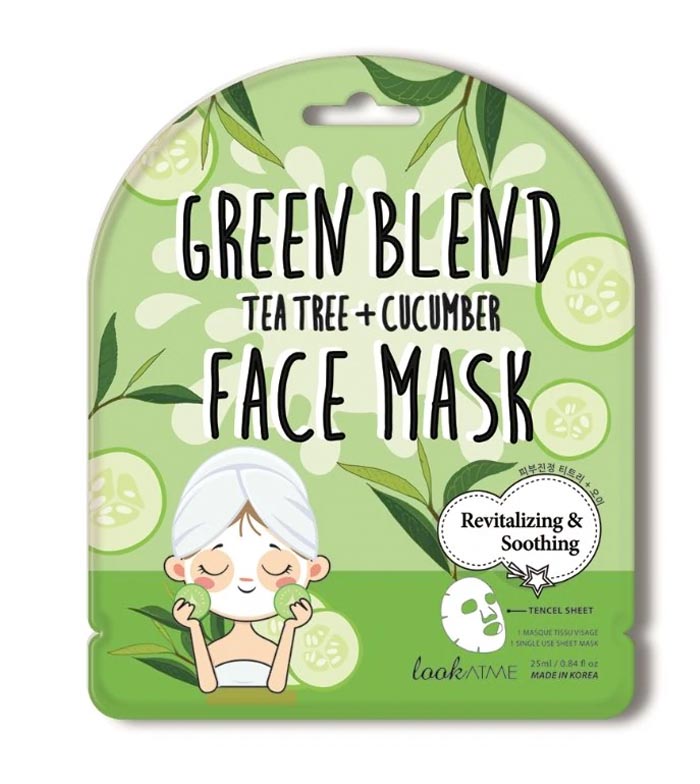 Máscara facial calmante e revitalizante com extratos de tea tree e pepino.