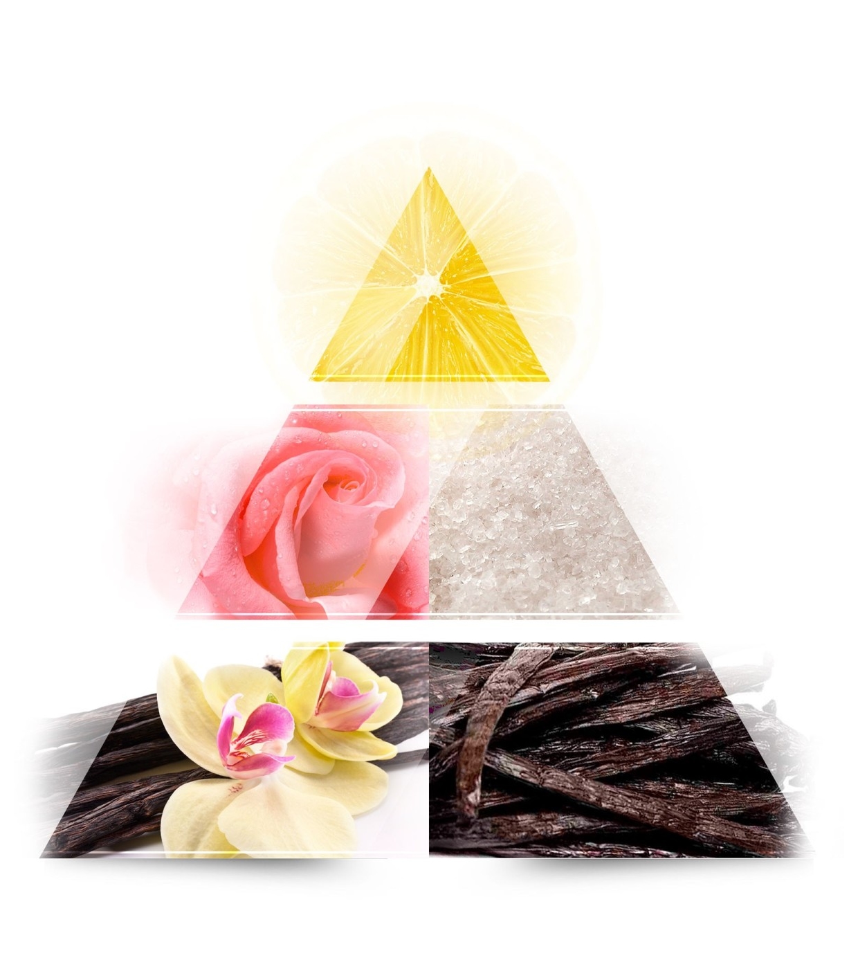 Sua abertura fresca com notas de limão traz luminosidade e leveza, dando lugar a um coração onde a rosa é envolvida por um acorde açucarado que confere um toque doce e sofisticado.