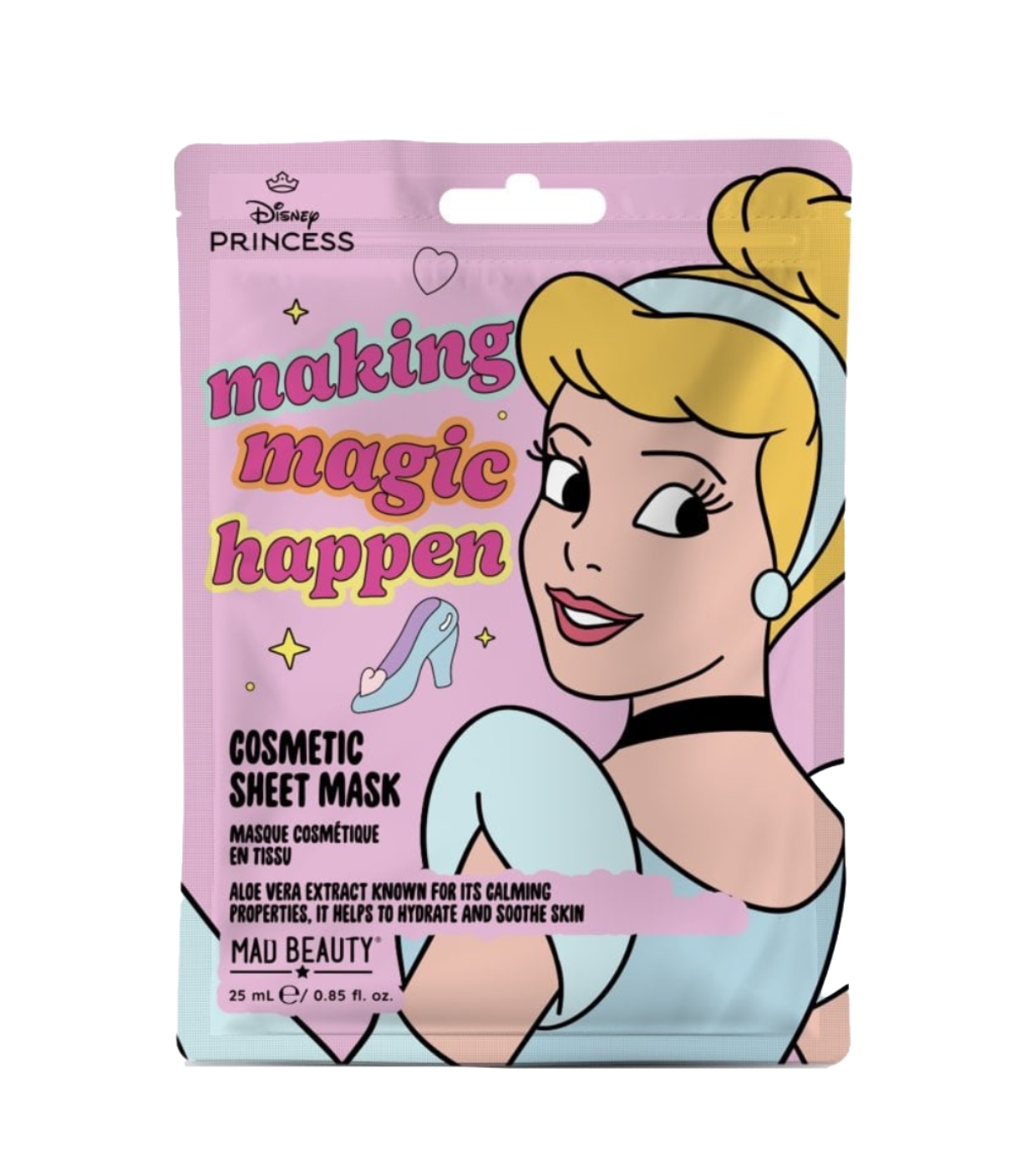 Exiba uma pele de sonho com esta máscara facial Mad Beauty estampada com a Princesa Cinderela da Disney, perfeita para preparar sua pele antes da maquiagem ou relaxá-la após um longo dia.
