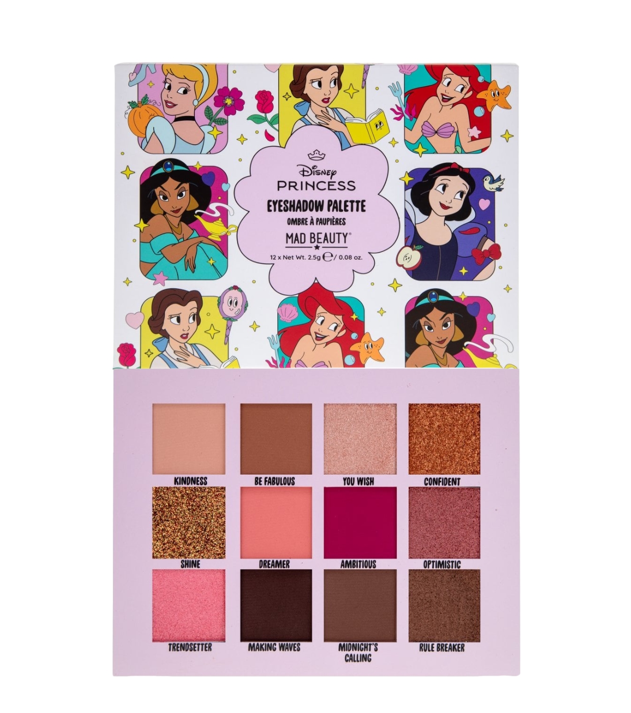Desperte a princesa que existe em você com esta paleta de sombras Disney de 12 tons da Mad Beauty , projetada para expressar seu estilo com cores ousadas, tons suaves e brilhos hipnotizantes.