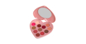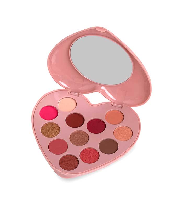 Esta paleta em forma de coração inclui tons românticos de rosa, roxo e marrom.