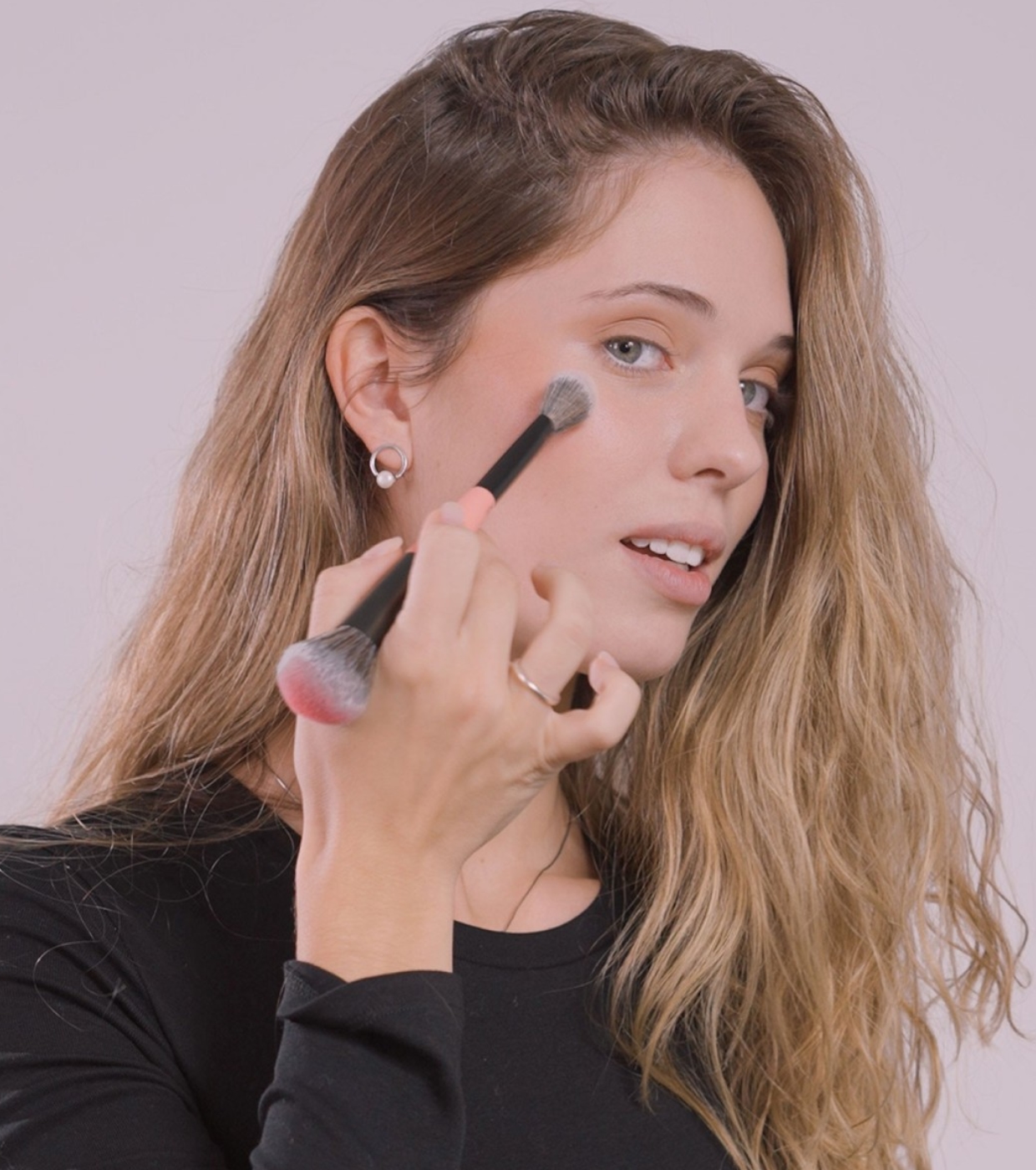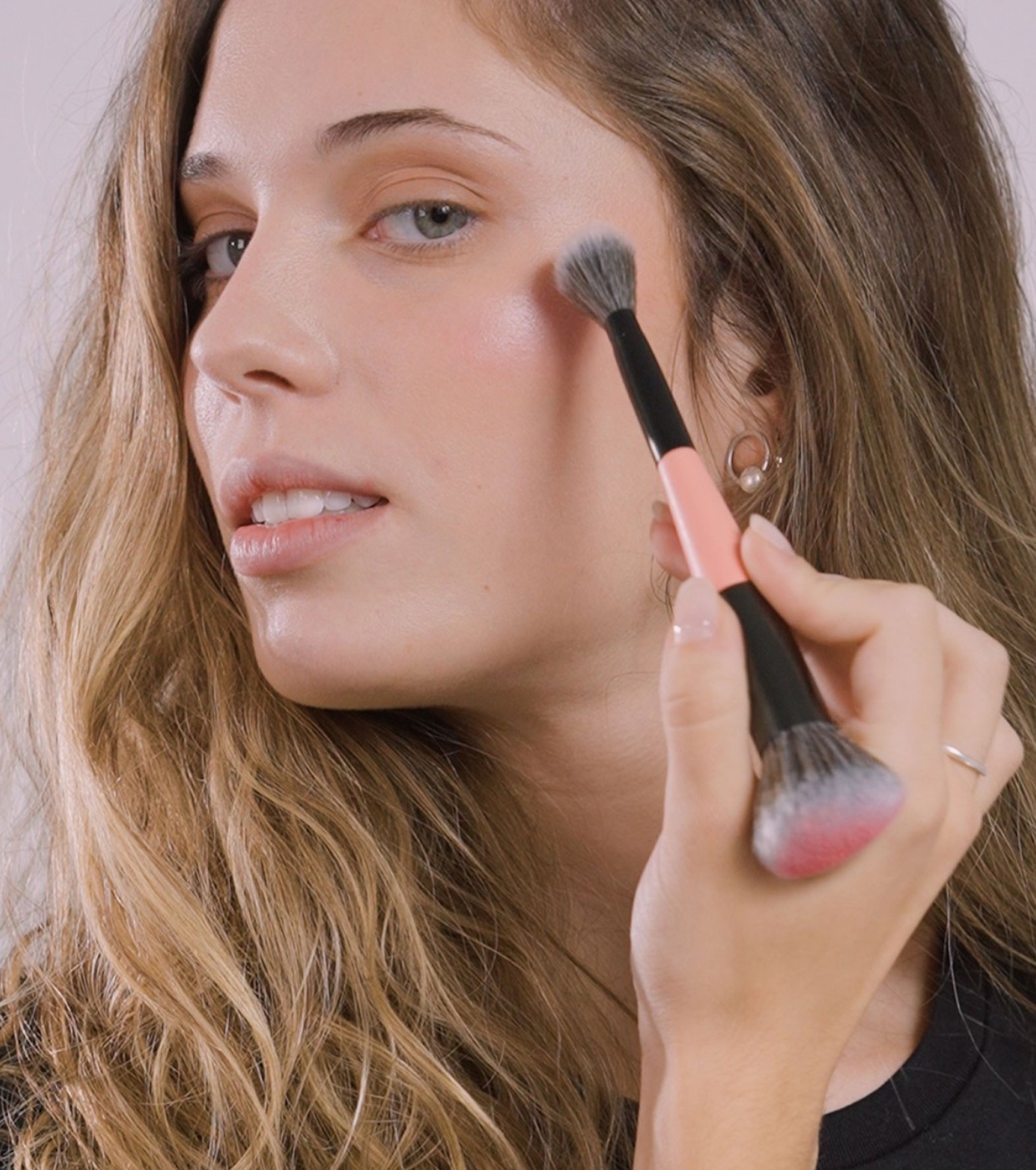 - Ponta larga: Esfuma e integra o blush cremoso nas maçãs do rosto e em áreas maiores do rosto. Permite a aplicação e o esfumado de bronzer ou base graças ao formato e à densidade de suas fibras.