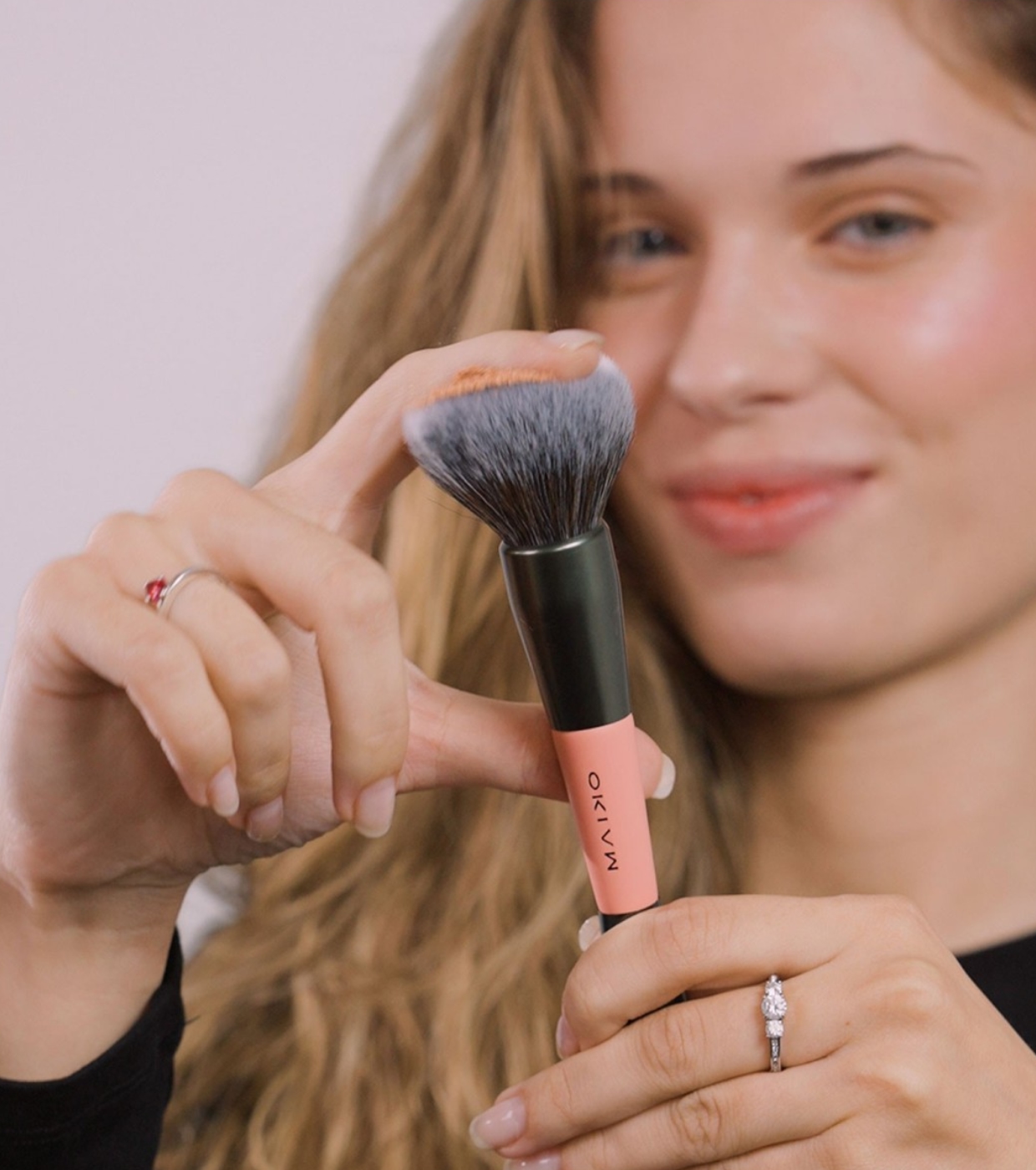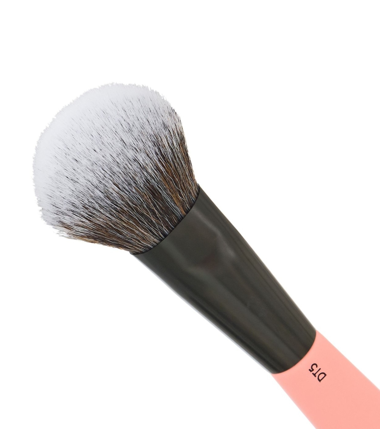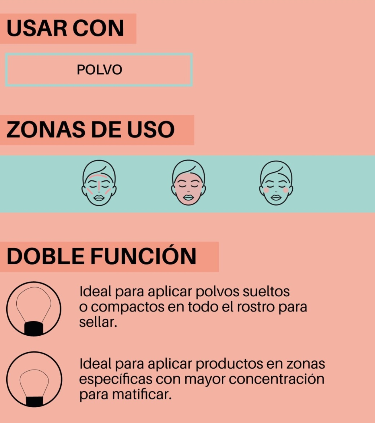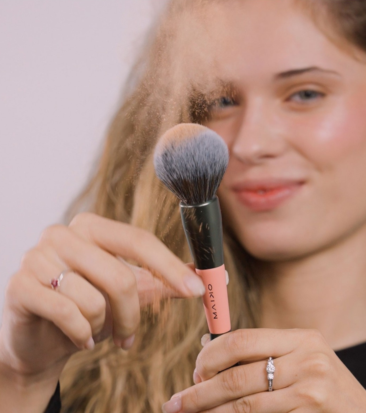 Seu design multifuncional 2 em 1 permite trabalhar com pós soltos ou compactos, blush, bronzer e até bases leves, combinando diversas funções em uma ferramenta prática e versátil.