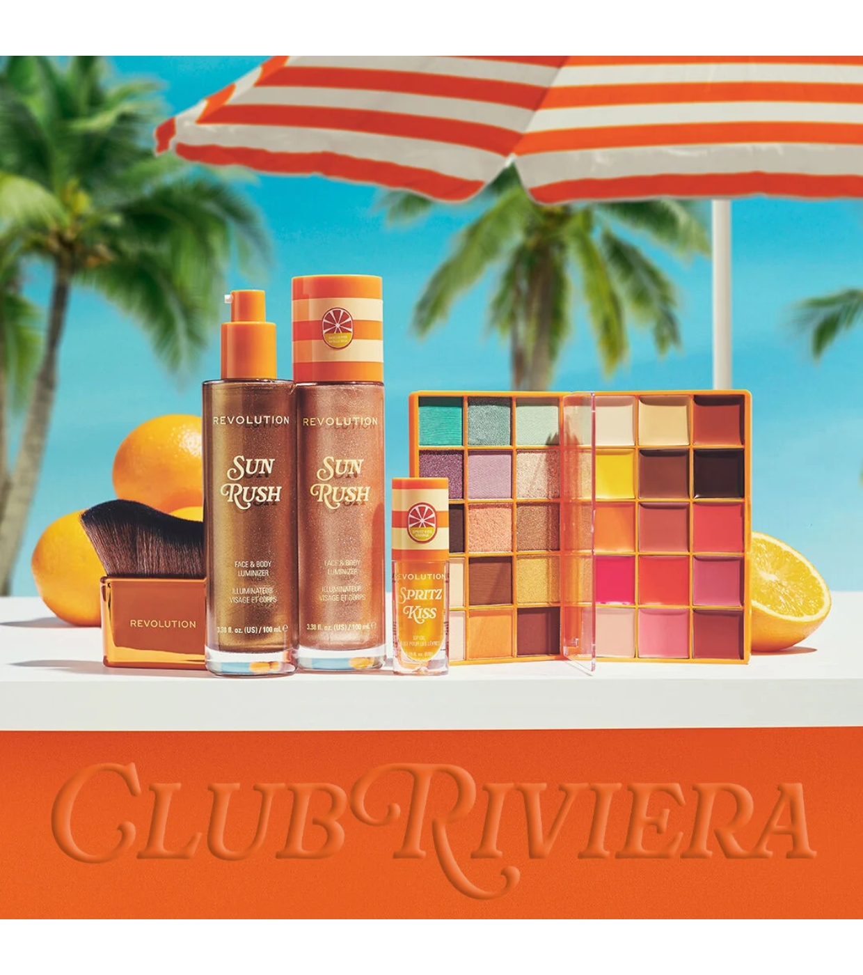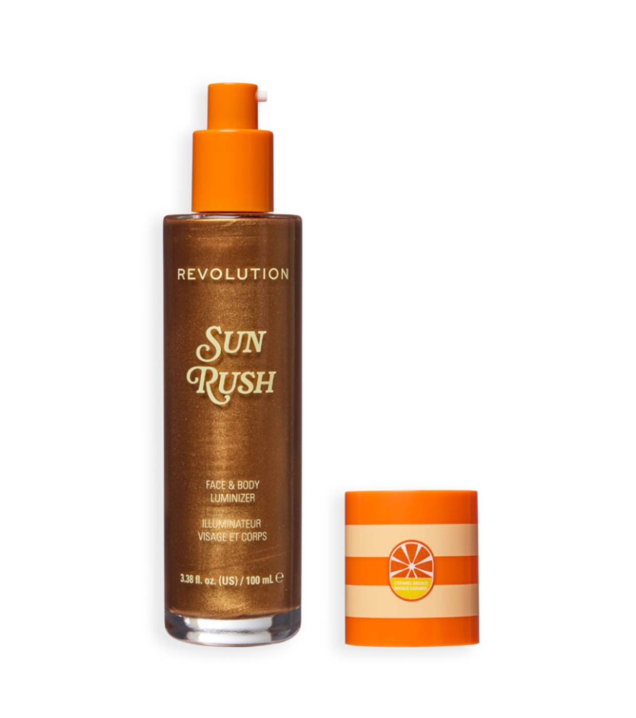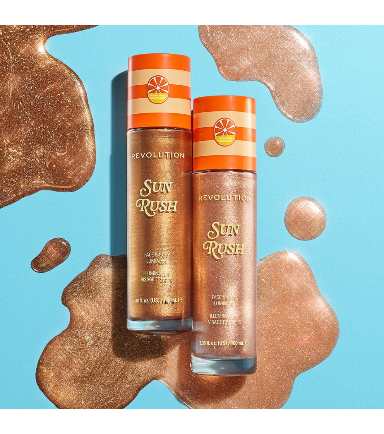 Consiga um brilho saudável e radiante da cabeça aos pés com o iluminador corporal Sun Rush da Revolution , que se funde perfeitamente à pele.