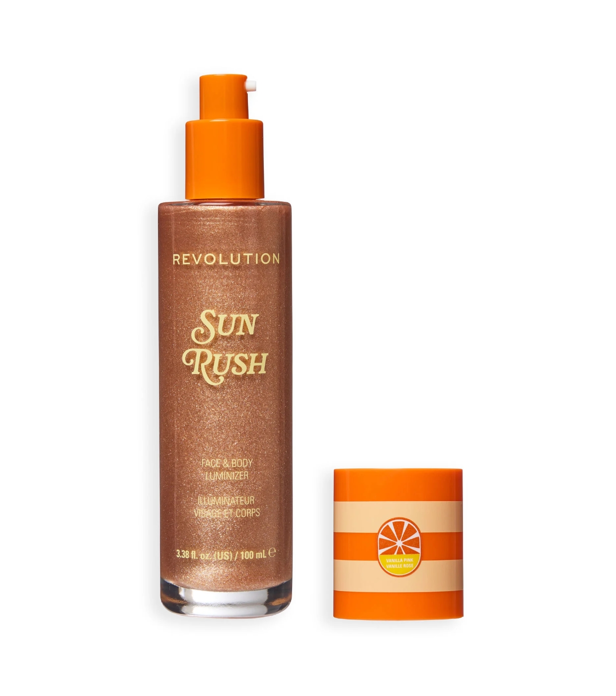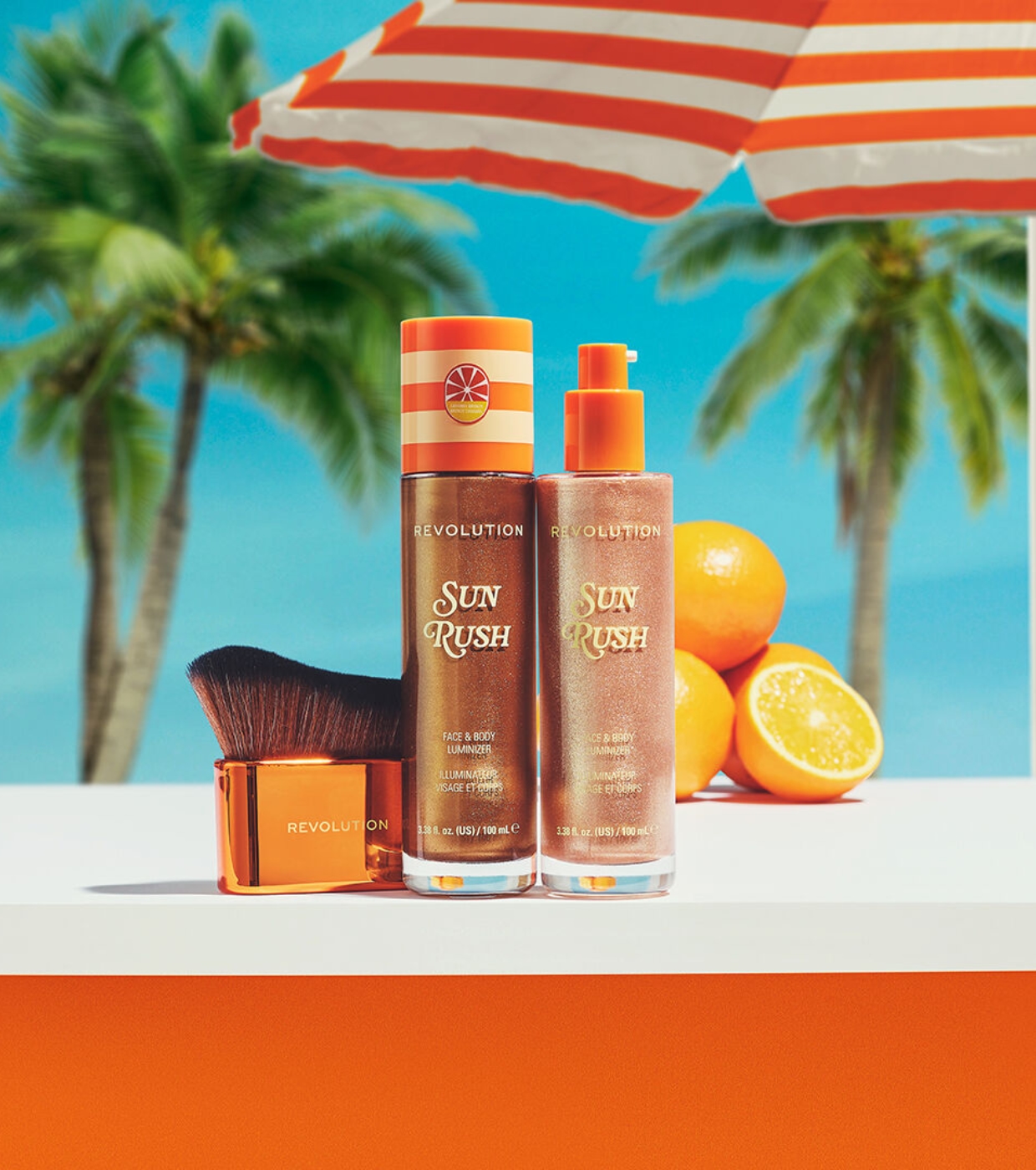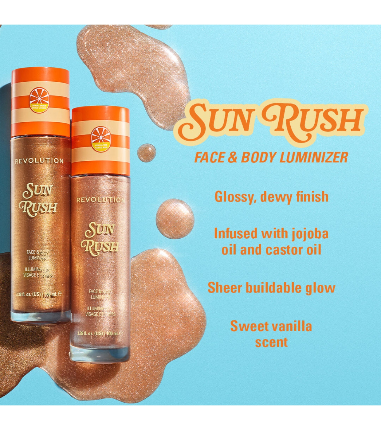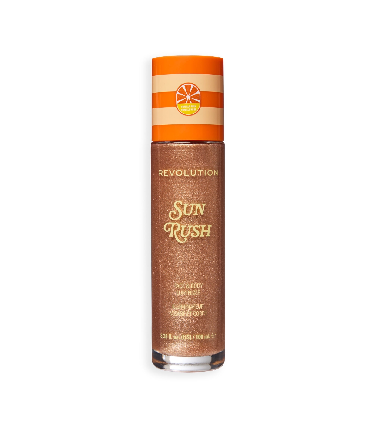 Consiga um brilho saudável e radiante da cabeça aos pés com o iluminador corporal Sun Rush da Revolution , que se funde perfeitamente à pele.