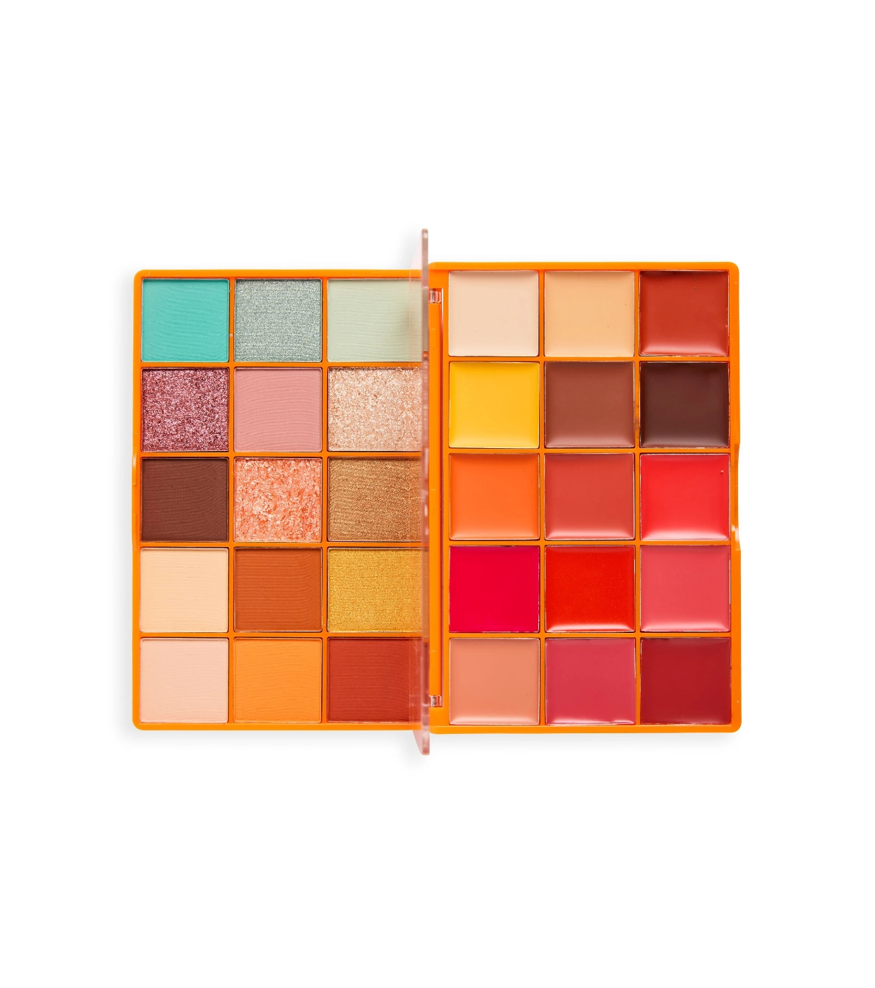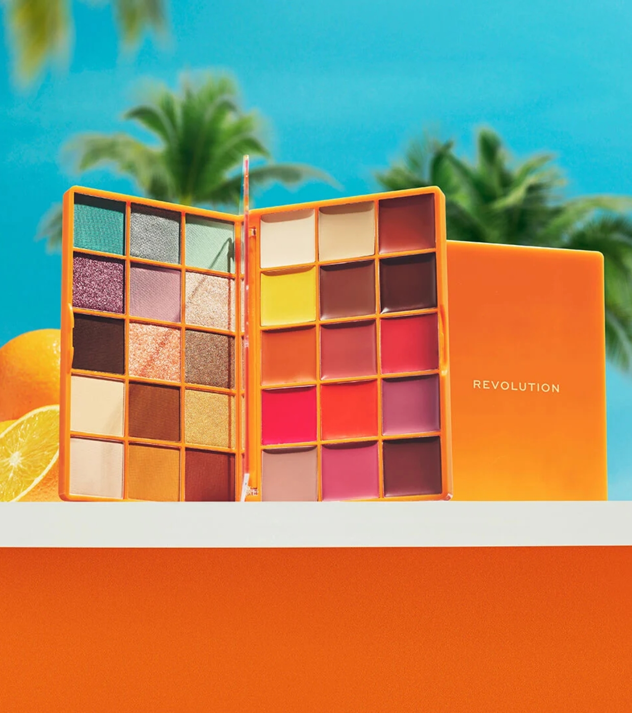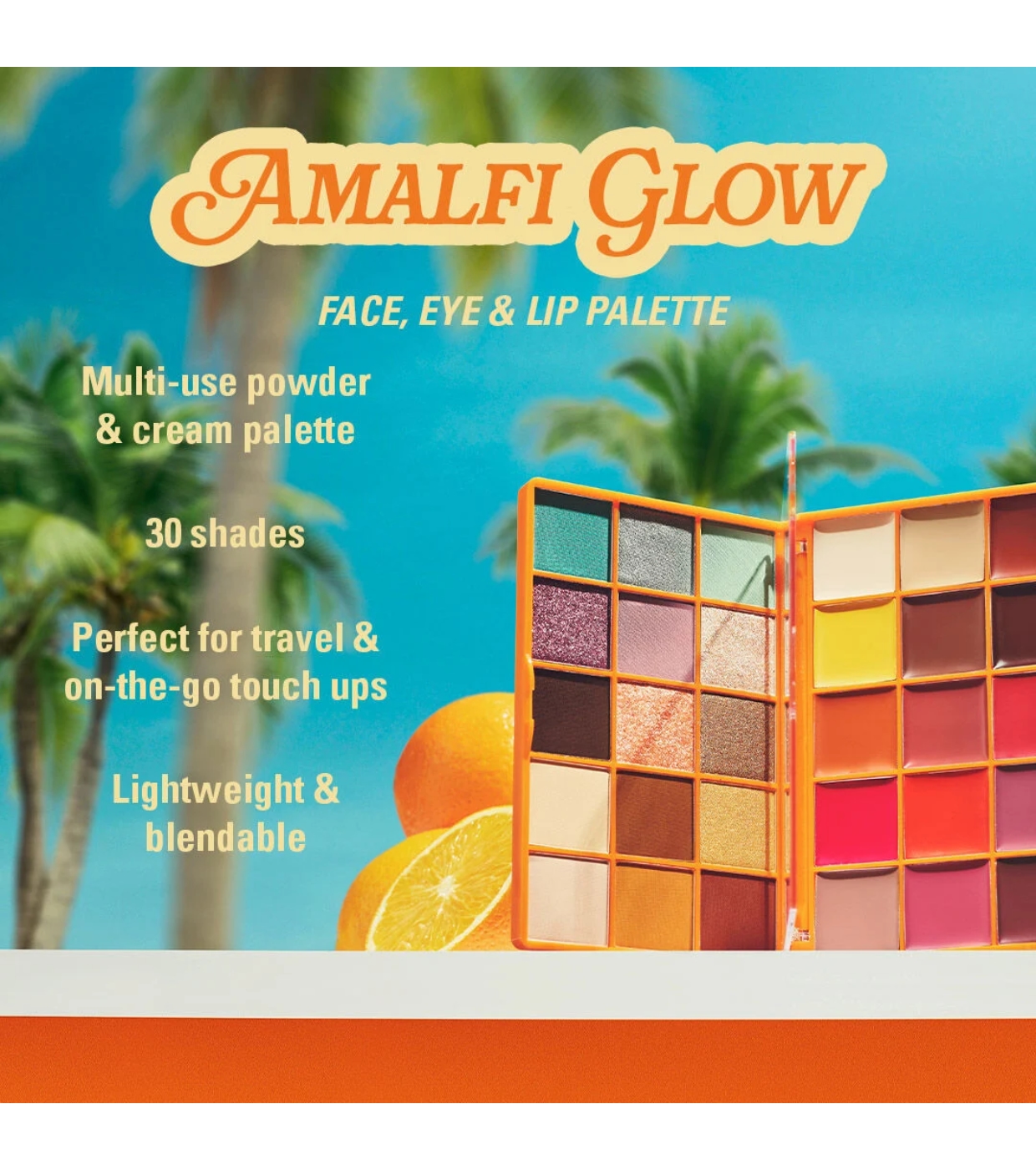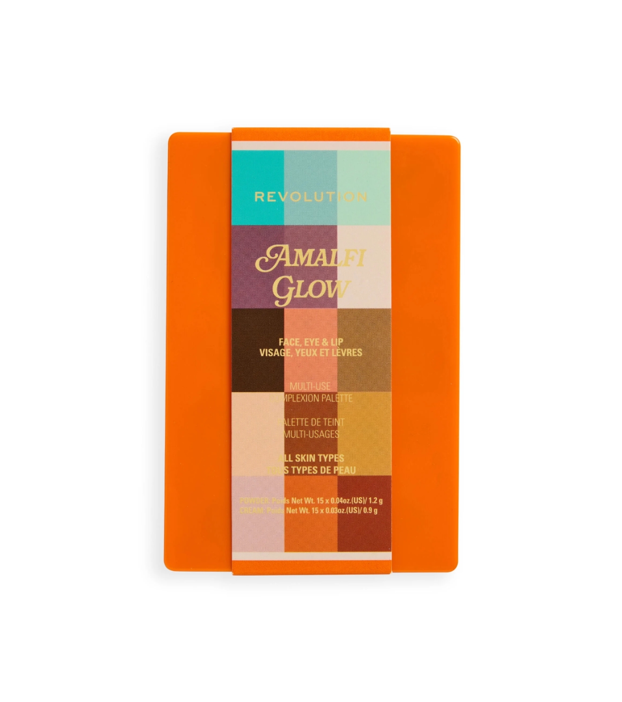Mergulhe nas cores vibrantes do verão com a paleta multiuso Amalfi Glow para rosto, olhos e lábios da Revolution..
