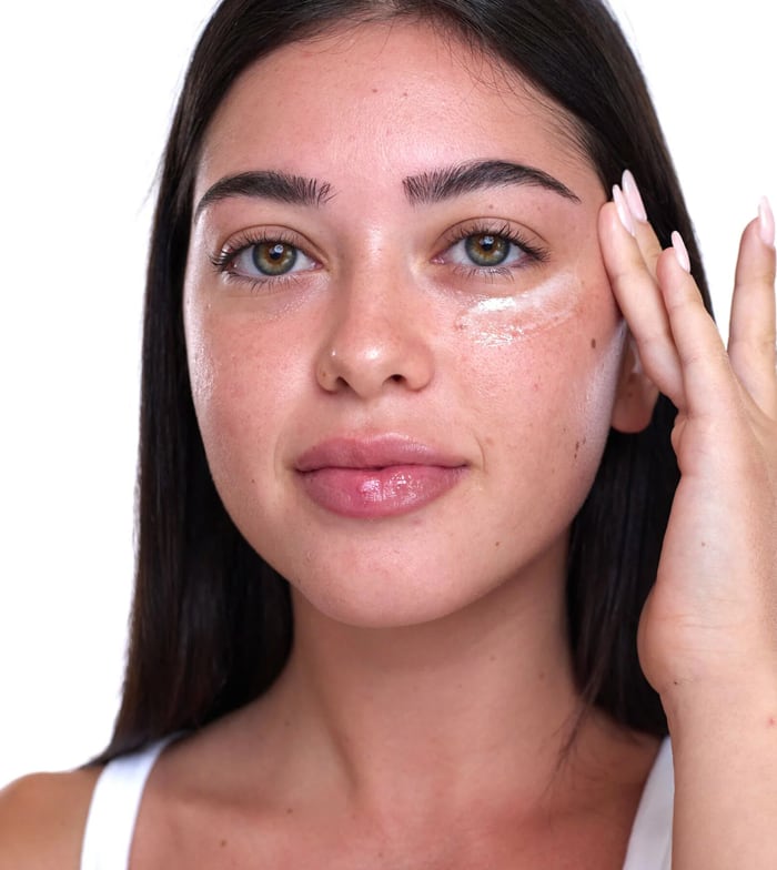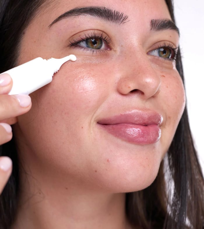 Com a pele completamente limpa, recomendo aplicar uma pequena quantidade, do tamanho de um grão de arroz (dois pontos se suas olheiras estiverem muito secas, um ponto se suas olheiras não estiverem tão desidratadas) na área do contorno dos olhos e massagear suavemente sem aplicar pressão.