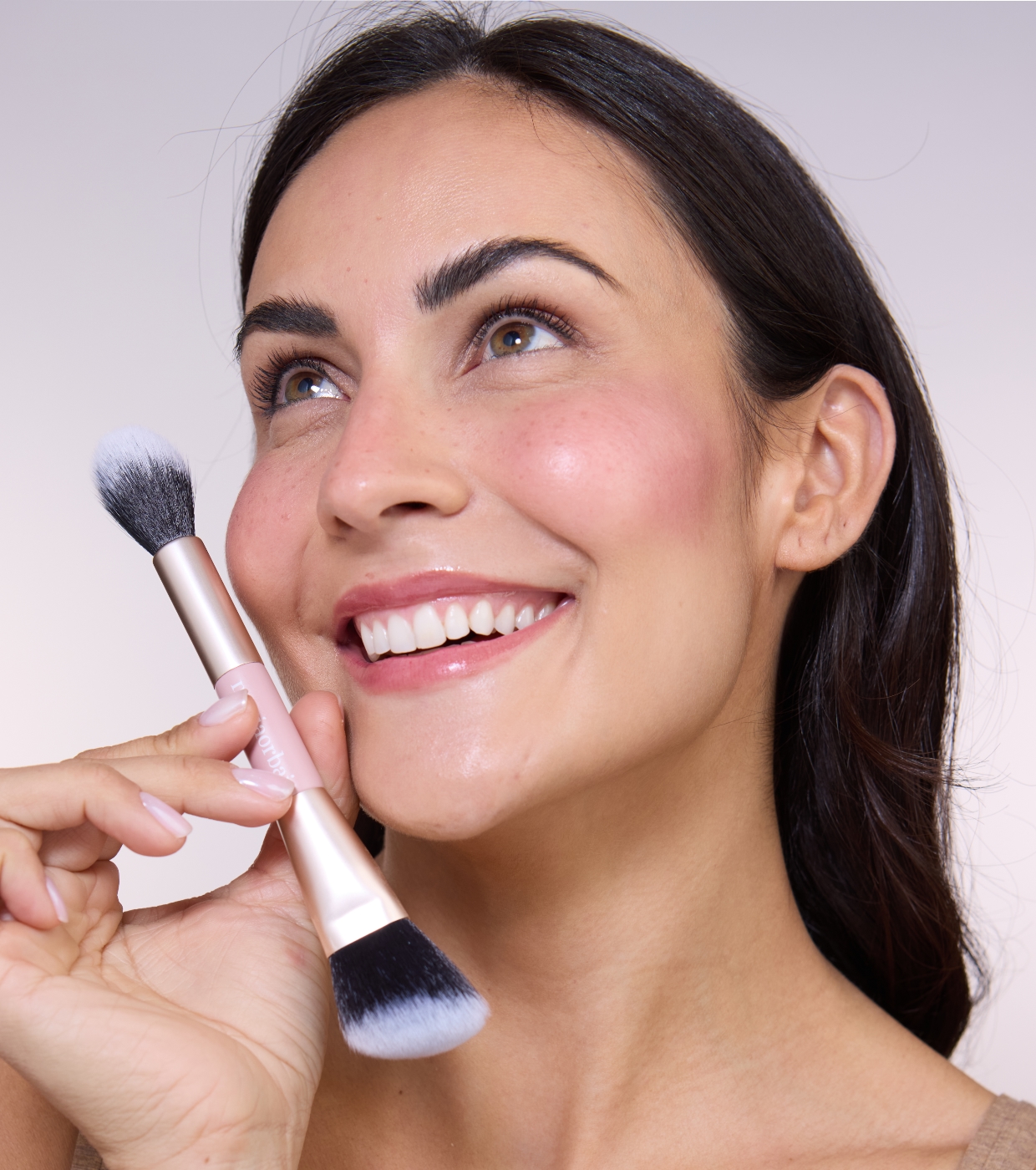 Graças à pressão exercida pela parte menor do pincel, ele aplica o produto, adicionando cobertura desde a primeira aplicação. Sendo um blush/bronzer com textura de bálsamo, este pincel adere o produto à pele depositando mais pigmento sem muito esforço.