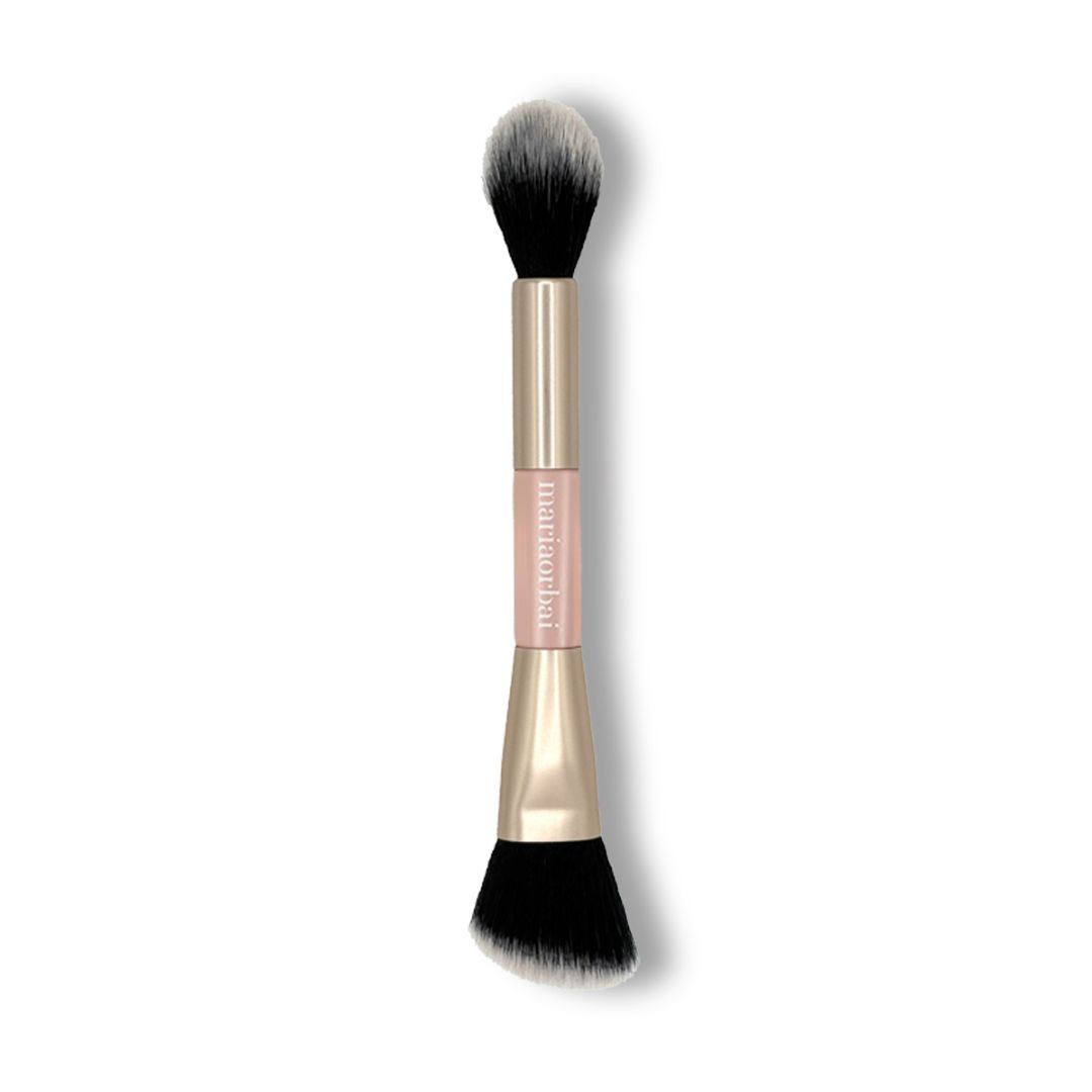 Graças ao formato largo da parte maior do pincel MO.05 da Maria Orbai, o produto é distribuído de forma muito uniforme e em pouco tempo. A parte interna do pincel aplica pressão para depositar o produto na pele e a parte externa, com pelos mais soltos, ajuda a difundi-lo e integrá-lo à pele.