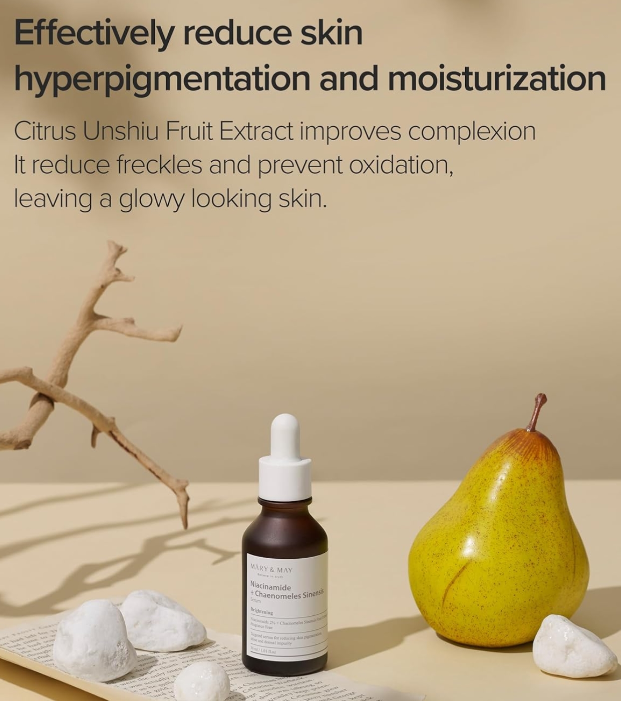 Mary & May Niacinamide + Chaenomeles Sinensis Serum é um sérum facial leve e de rápida absorção, desenvolvido para melhorar a luminosidade, equilibrar a pele e uniformizar o tom.
