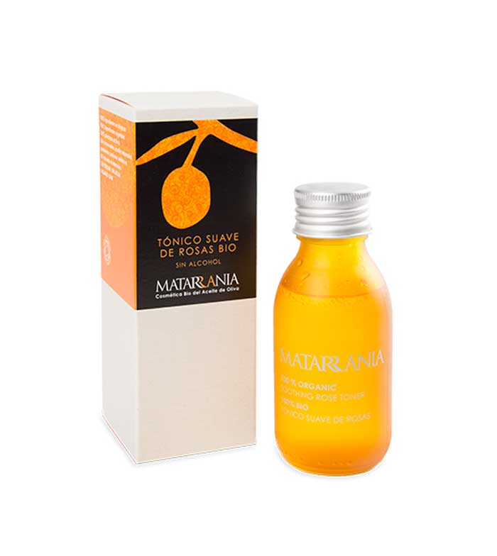 Toner Facial Macio 100% Bio Matarrania Rose, um tônico com um agradável aroma de rosa, adequado para todos os tipos de pele, mesmo os mais sensíveis.
