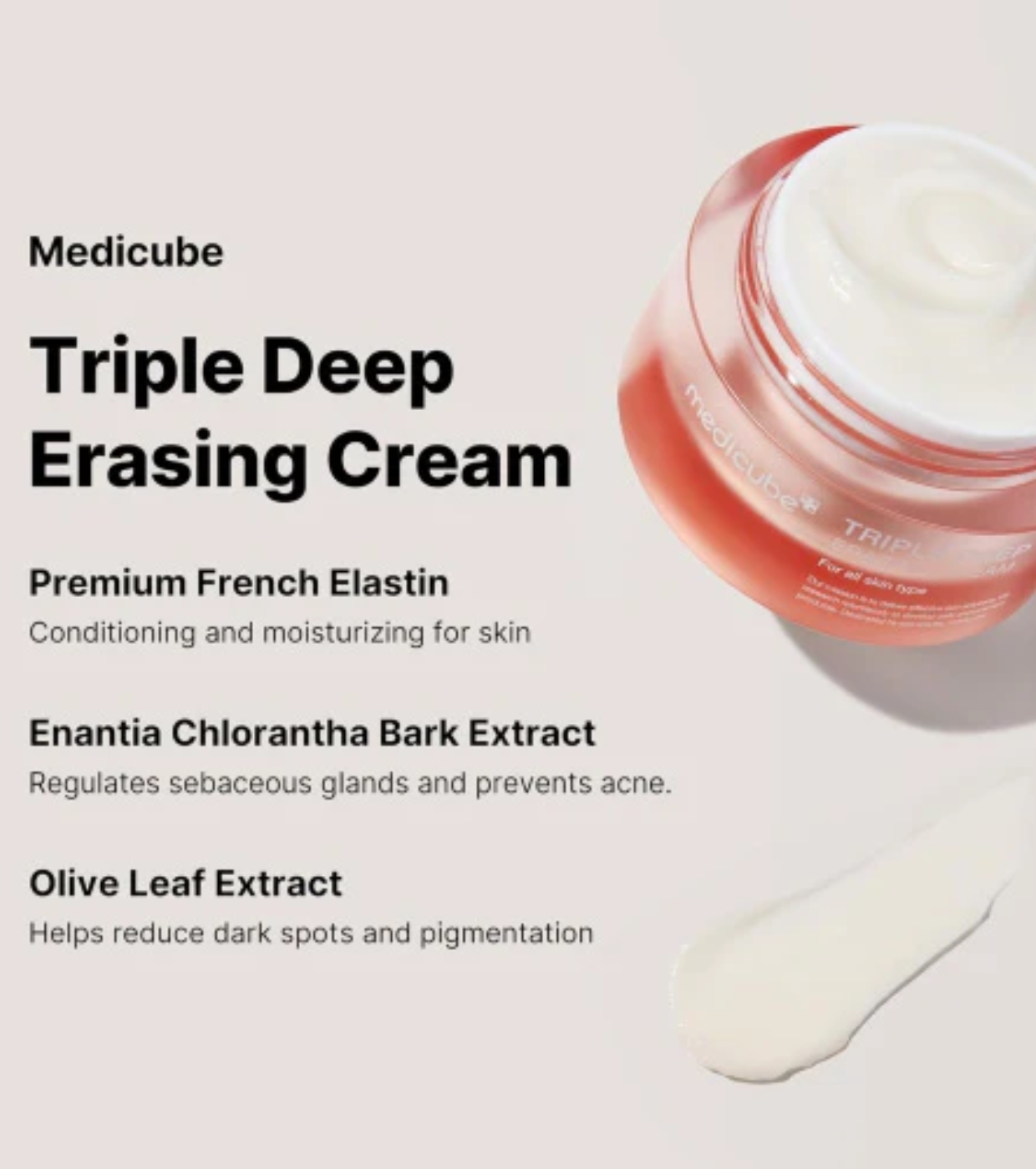 Triple Deep Erasing Cream Water, Glycerin, Dipropylene Glycol, Cetearyl Alcohol, Cyclopentasiloxane, Caprylic/Capric Triglyceride, Triethylhexanoin, Hydrogenated Polydecene, 1,2-Hexanediol, Niacinamide, Hydrogenated Poly(C6-14 Olefin), Cyclohexasiloxane, Dioscorea Japonica Root Extract, Cetearyl Glucoside, Glyceryl Stearate Se, Aesculus Hippocastanum (Horse Chestnut) Extract, Pseudoalteromonas Ferment Extract, Piper Methysticum Leaf/Root/Stem Extract, Centella Asiatica Extract, Panax Ginseng Berry Extract, Oenothera Biennis (Evening Primrose) Flower Extract, Ulmus Davidiana Root Extract, Pinus Palustris Leaf Extract, Pueraria Lobata Root Extract, Enantia Chlorantha Bark Extract, Lupinus Albus Seed Extract, Olea Europaea (Olive) Leaf Extract, Cryptomeria Japonica Leaf Extract, Nelumbo Nucifera Leaf Extract, Cinnamomum Zeylanicum Bark Extract, Hydrogenated Lecithin, Argania Spinosa Kernel Oil, Sodium Hyaluronate, Helianthus Annuus (Sunflower) Seed Oil, Dimethicone, Squalane, C12-16 Alcohols, Glyceryl Stearate, Cetearyl Olivate, Sorbitan Olivate, Hydroxyethyl Acrylate/Sodium Acryloyldimethyl Taurate Copolymer, Fructose, Microcrystalline Cellulose, Butylene Glycol, Palmitic Acid, Methylpropanediol, Hydrogenated Polyisobutene, Polyquaternium-51, Betaine, Alcohol, Glycosyl Trehalose, Isononyl Isononanoate, Polyglyceryl-10 Stearate, Cellulose Gum, Hydrolyzed Corn Starch, Hydrogenated Starch Hydrolysate, Beta-Glucan, Raffinose, Biosaccharide Gum-1, Stearic Acid, Butyrospermum Parkii (Shea) Butter, Adenosine, Polyglyceryl-2 Dipolyhydroxystearate, Disodium Edta, Lecithin, Sucrose, Bisabolol, Panthenol, Inulin Lauryl Carbamate, Folic Acid, Disodium Stearoyl Glutamate, Citric Acid, Ceramide Np, Cholesterol, Ascorbyl Glucoside, Zinc Pca, Tromethamine, Palmitoyl Tripeptide-5, Saccharomyces Ferment Filtrate, Capryloyl Glycine, Hexylene Glycol, 3-O-Ethyl Ascorbic Acid, Tocopherol, Sarcosine, Maltodextrin, Saccharide Hydrolysate, Palmitoyl Pentapeptide-4, Oleanolic Acid, Hydrolyzed Elastin, Desamido Collagen, Peg-100 Stearate, Polysorbate 60, Fragrance, Ethylhexylglycerin, Potassium Sorbate, Caprylyl Glycol, Linalool, Benzyl Salicylate, Limonene, Hydroxycitronellal.Water, Propanediol, Dipropylene Glycol, Butylene Glycol, Methylpropanediol, Diethoxyethyl Succinate, Ethoxydiglycol, Ammonium Acryloyldimethyltaurate/Beheneth-25 Methacrylate Crosspolymer, Niacinamide, Trehalose, 1,2-Hexanediol, Chlorella Vulgaris Extract, Collagen, Hydrolyzed Collagen, Cynanchum Atratum Extract, Althaea Rosea Flower Extract, Soluble Collagen, Allium Sativum (Garlic) Bulb Extract, Avena Sativa (Oat) Kernel Extract, Bertholletia Excelsa Seed Extract, Brassica Oleracea Italica (Broccoli) Extract, Camellia Sinensis Seed Extract, Salmon Egg Extract, Solanum Lycopersicum (Tomato) Fruit Extract, Spinacia Oleracea (Spinach) Leaf Extract, Vaccinium Angustifolium (Blueberry) Fruit Extract, Wine Extract, Polyglyceryl-10 Isostearate, Tromethamine, Glucose, Polyglyceryl-10 Oleate, Ethylhexylglycerin, Fructooligosaccharides, Fructose, Adenosine, Sodium Phytate, Cyanocobalamin, Tocopherol, Pullulan, Glycerin, Hydroxypropyltrimonium Hyaluronate, Squalane, Soluble Proteoglycan, Hydrolyzed Elastin, Sodium DNA, Carbomer, Xanthan Gum, Fragrance(Parfum)