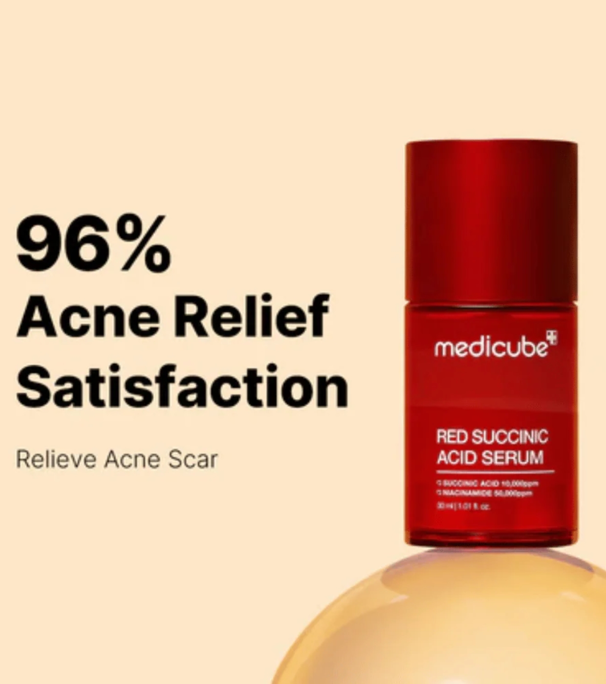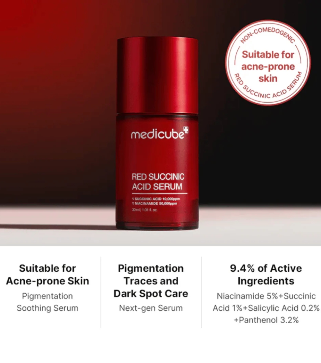 Clareie e equilibre sua pele com Medicube Red Succinic Acid Clarifying Serum , um sérum esfoliante não comedogênico e hipoalergênico especialmente formulado para peles sensíveis, desequilibradas ou propensas à acne.