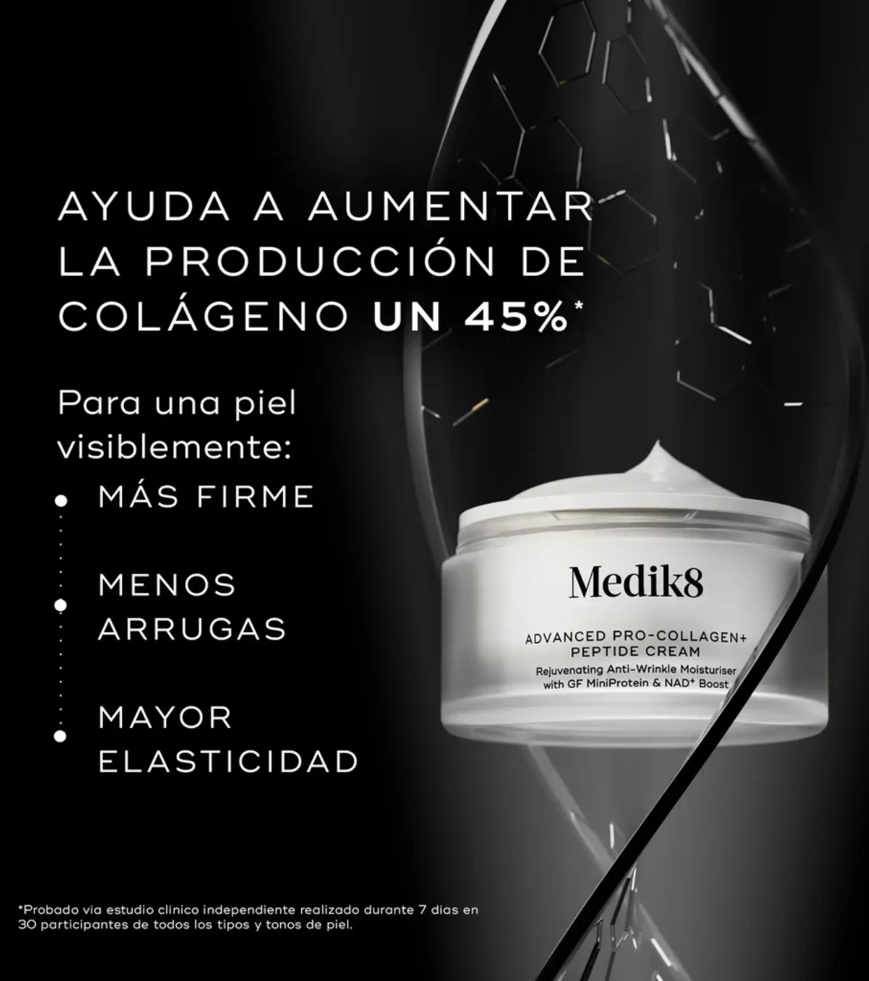 Advanced Pro-Collagen+ Peptide Cream da Medik8 é um creme anti-idade de alto desempenho que aumenta a produção de colágeno em até 45%1 e promove a longevidade ideal da pele.