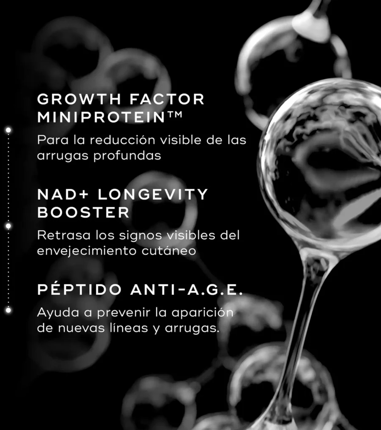 Com base na ciência regenerativa, combina ativos de última geração, como o Growth Factor MiniProtein™, o intensificador da longevidade NAD+ e o peptídeo Anti-AGE, que atuam em sinergia para restaurar a estrutura da pele e proporcionar uma pele mais lisa, esculpida e visivelmente mais jovem.