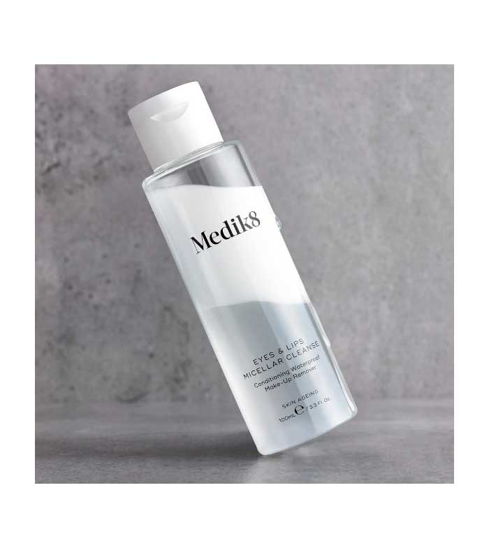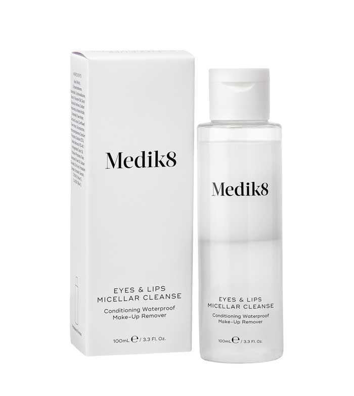 Remova a maquiagem de olhos e lábios mais resistente e uniforme waterproof com o removedor de maquiagem para olhos e lábios Medik8 Micellar Cleanse .