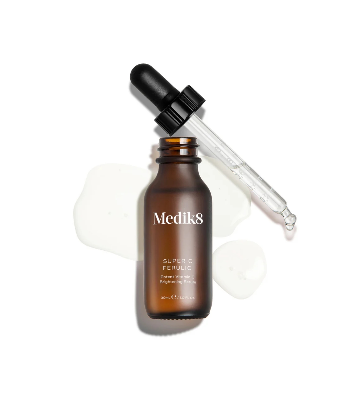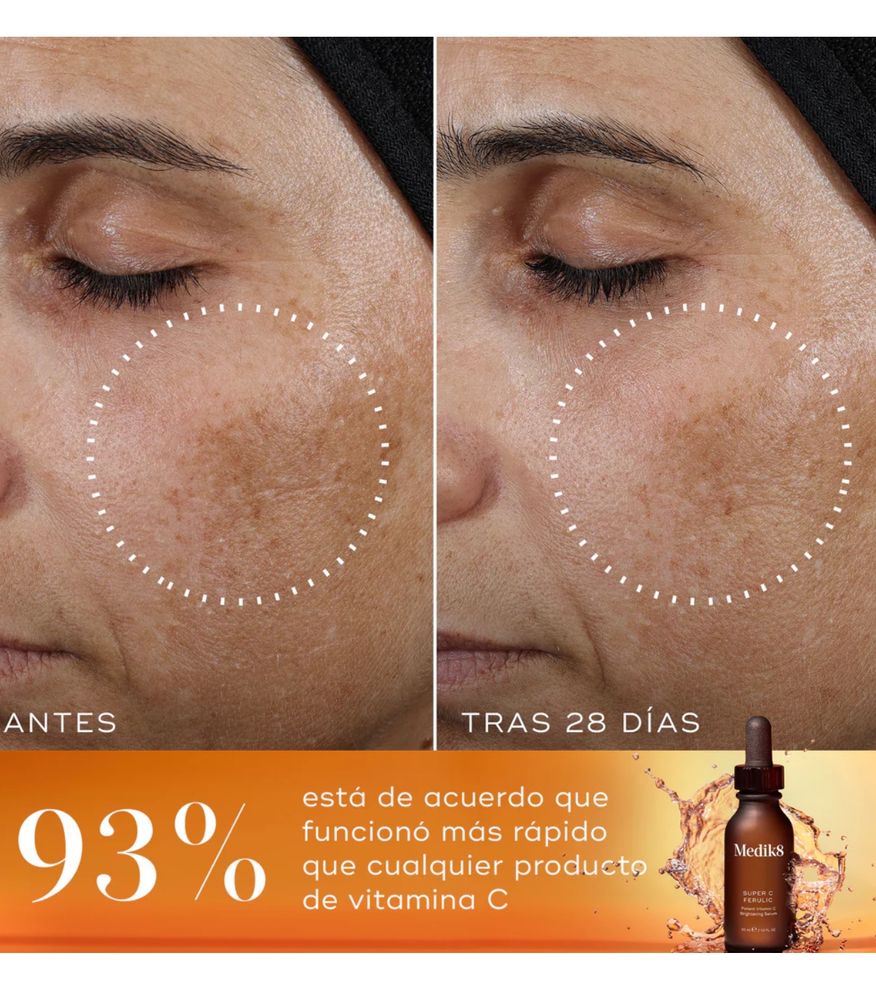 Super C Ferulic™ da Medik8 é o sérum iluminador com vitamina C mais potente da marca, formulado para combater eficazmente os 4 sinais avançados de envelhecimento solar: rugas, manchas escuras, perda de firmeza e tom de pele irregular*.