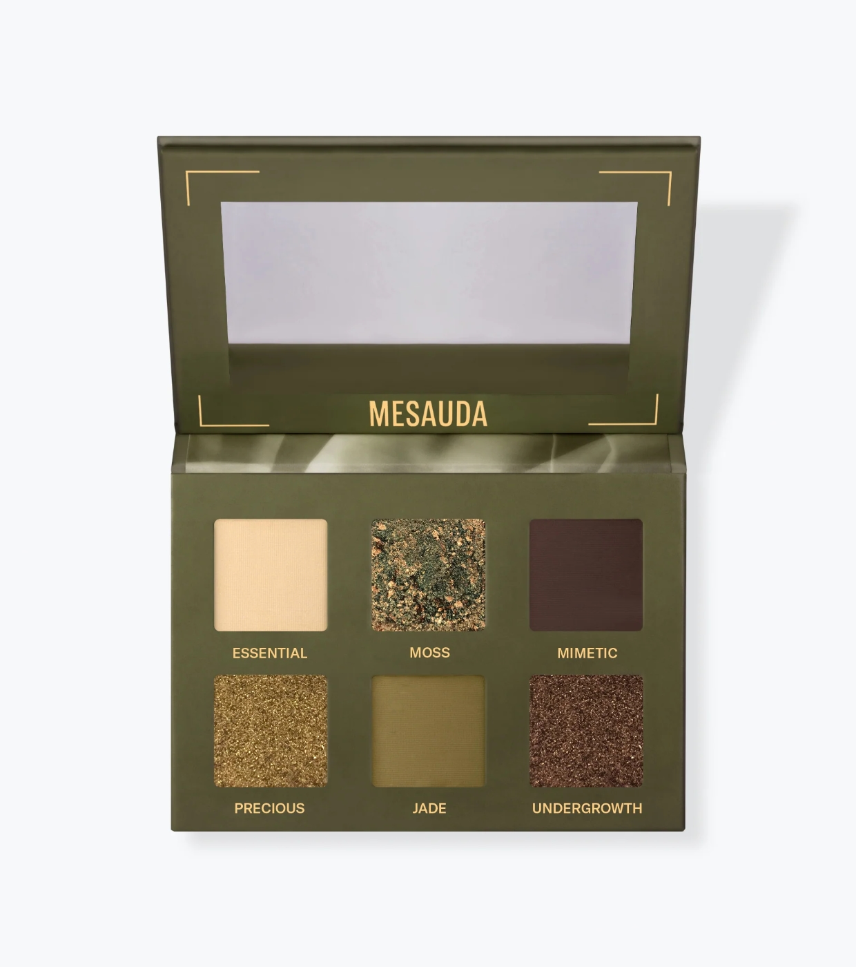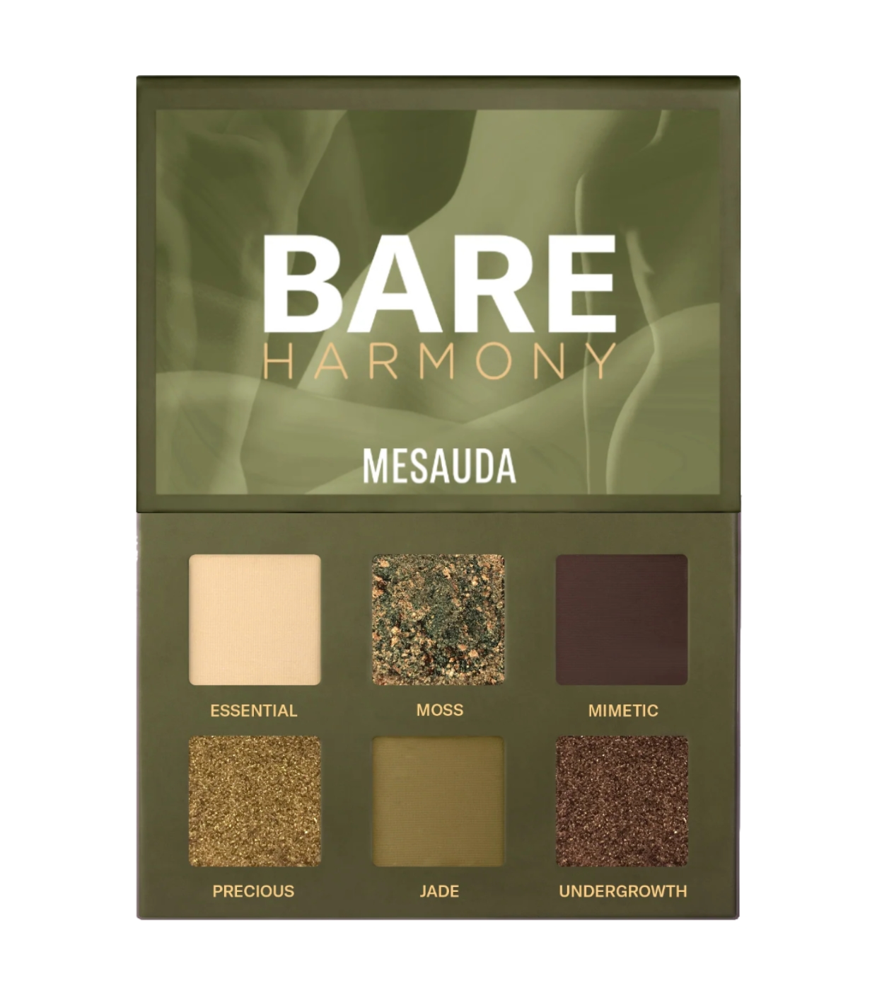 A paleta de sombras Bare Harmony 3.0 da Mesauda apresenta tons de verde intensos e envolventes, perfeitos para criar looks únicos, sofisticados e misteriosos, capazes de realçar os olhos com um toque especial e elegante.