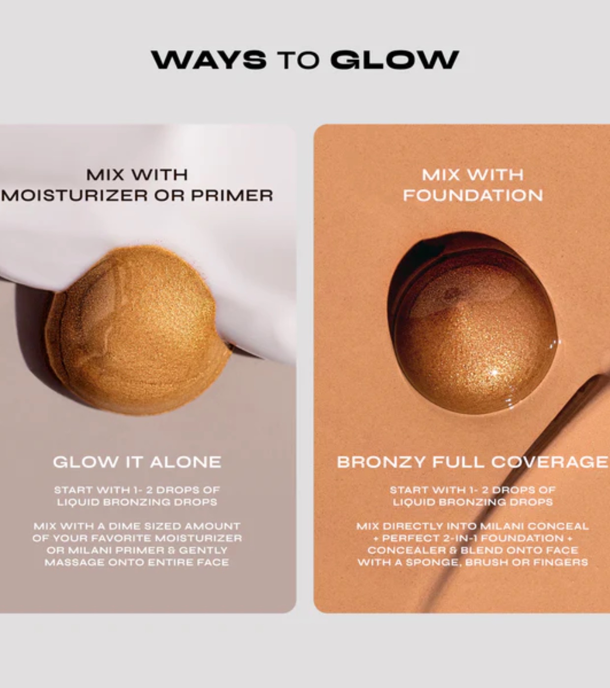 Misture 1 a 2 gotas do produto em uma quantidade do tamanho de uma moeda de dez centavos do seu hidratante favorito ou Milani Face Primer e espalhe com os dedos por todo o rosto para obter uma base impecável e brilhante.