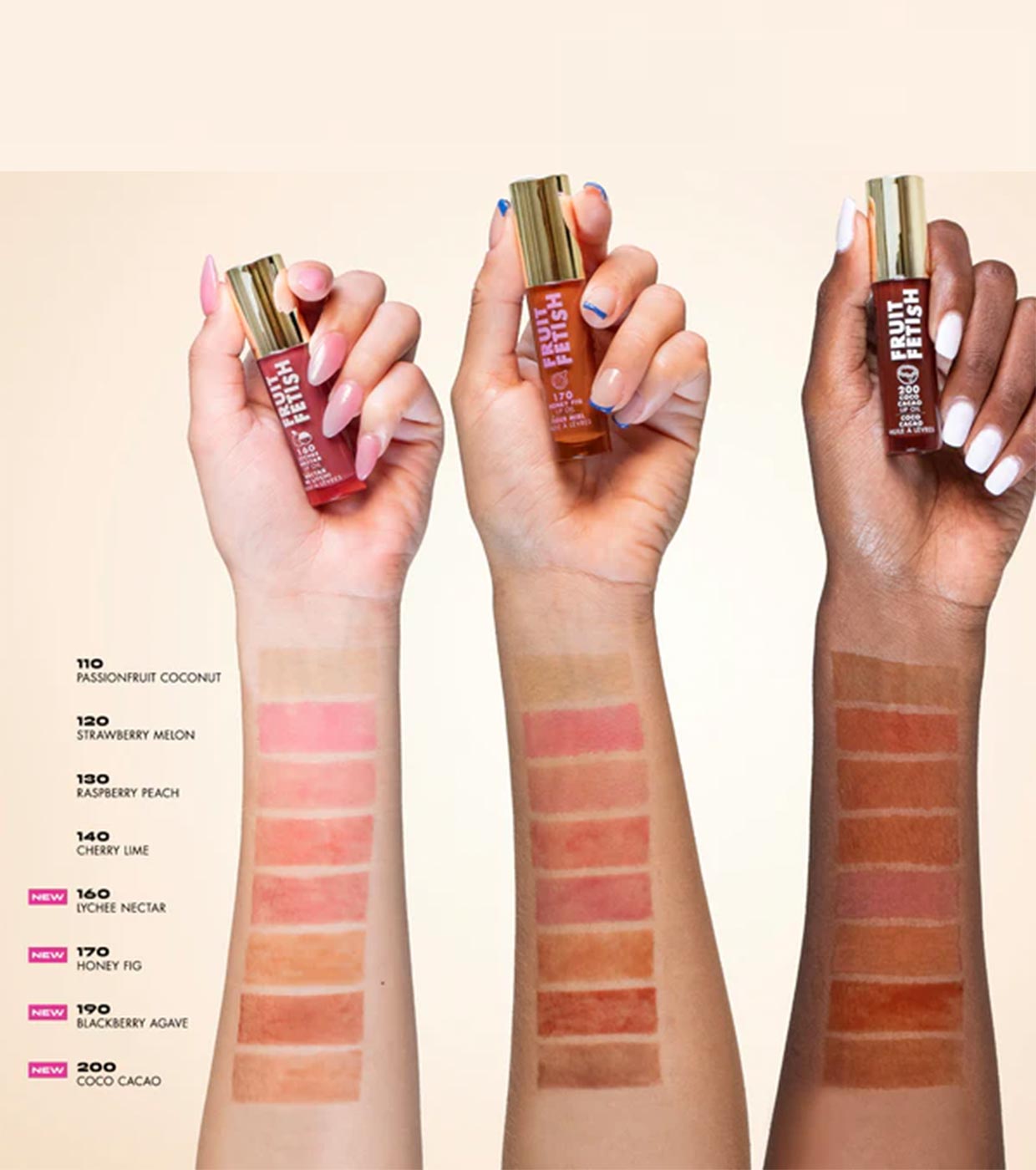 Os óleos labiais Fruit Fetish foram formulados com extratos de frutas e vitamina E para nutrir e hidratar os lábios, dando-lhes uma sensação ultraconfortável.