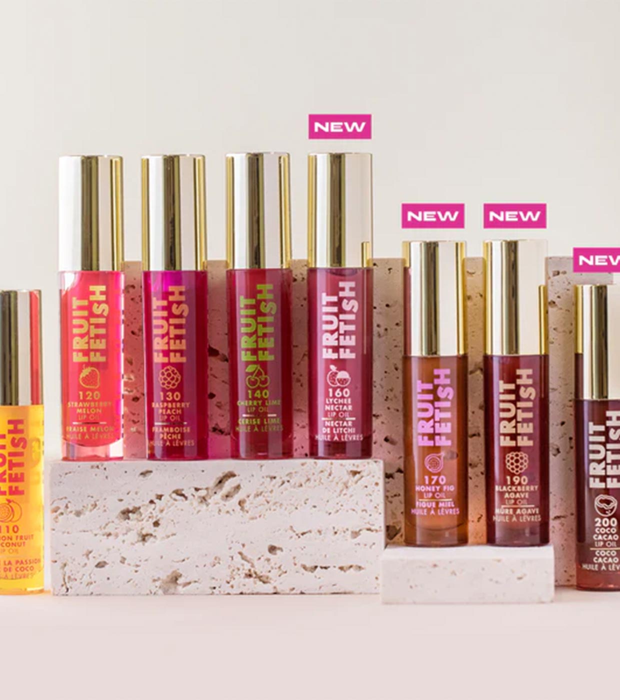 Os óleos labiais Fruit Fetish foram formulados com extratos de frutas e vitamina E para nutrir e hidratar os lábios, proporcionando-lhes uma sensação ultraconfortável.
