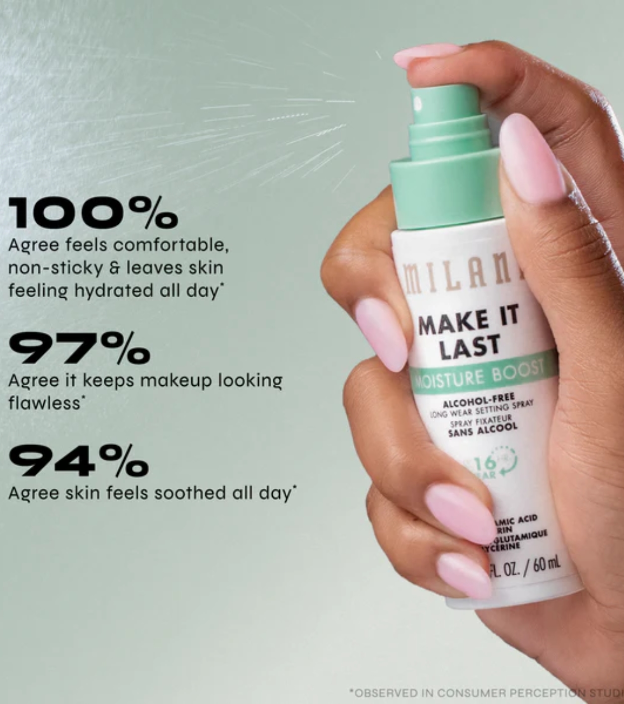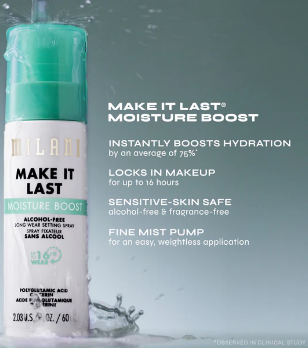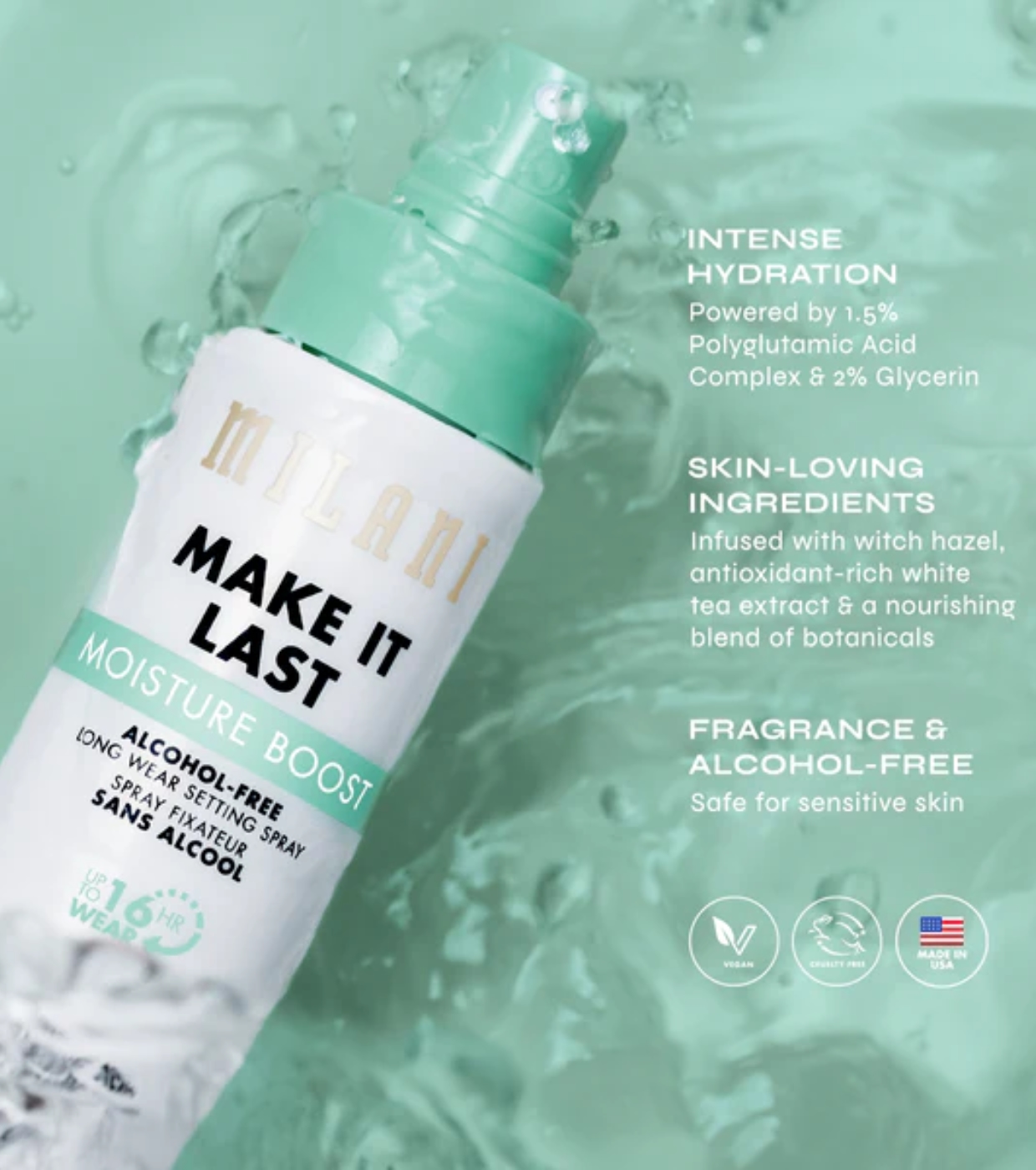 Bem-vinda à hidratação de longa duração! O spray fixador de maquiagem Make it Last Moisture Boost da Milani amplia a icônica coleção Make It Last com uma fórmula focada no cuidado da pele.