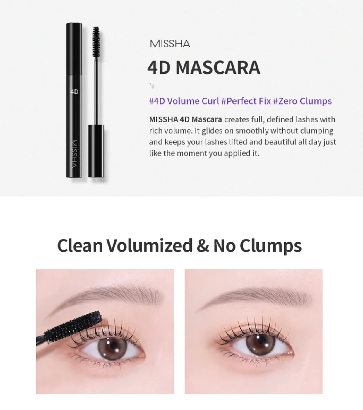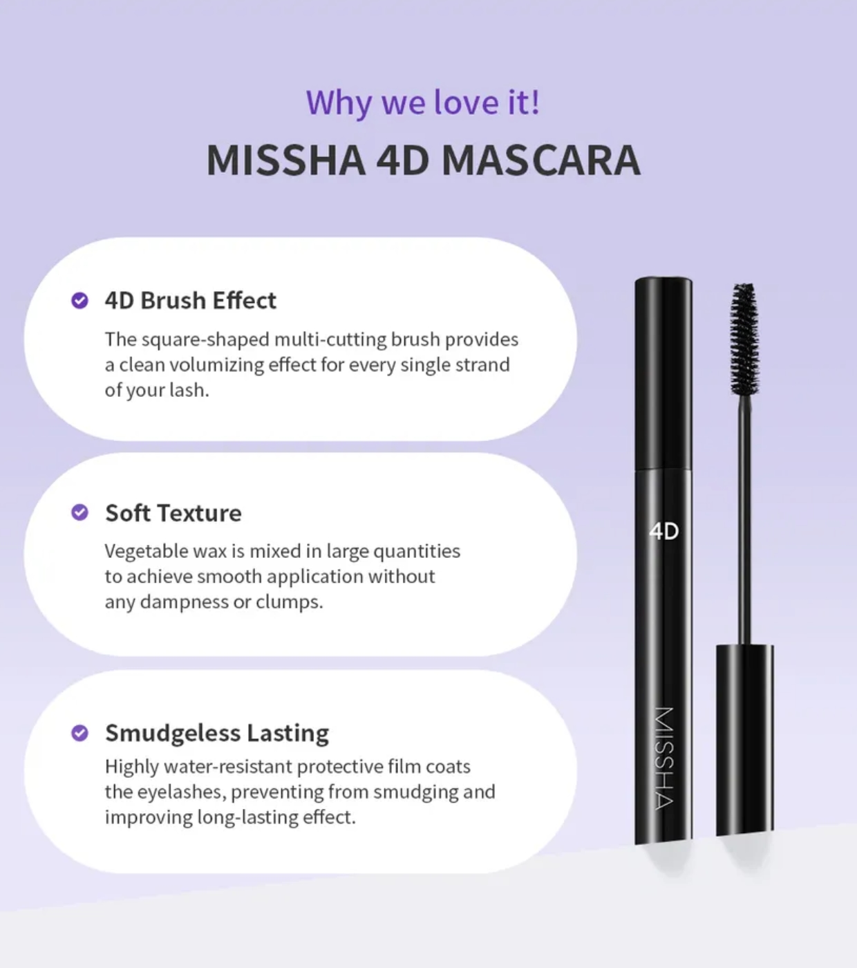 A máscara para cílios 4D Mascara da Missha é uma máscara volumizadora, ideal para cílios finos ou ralos.