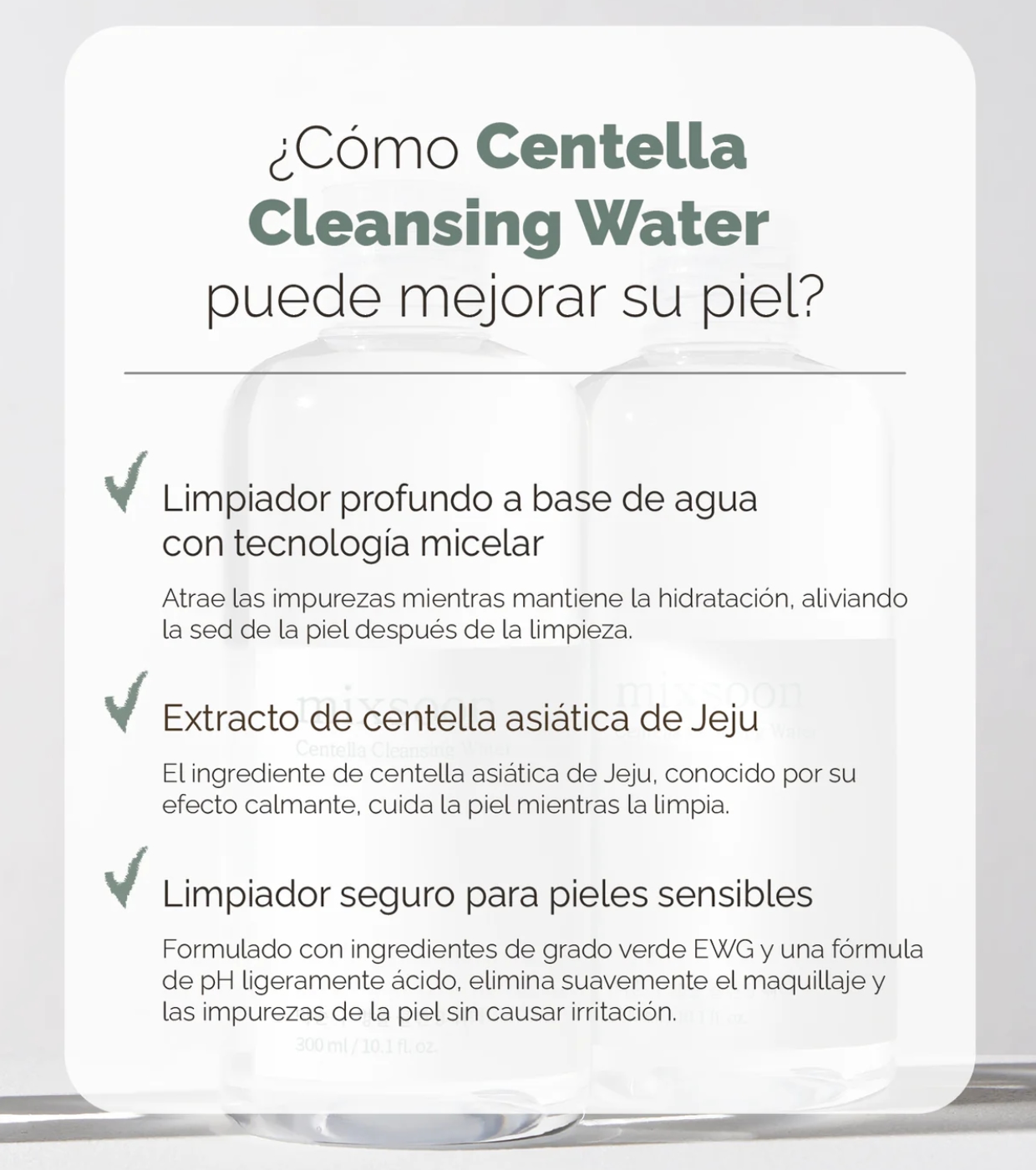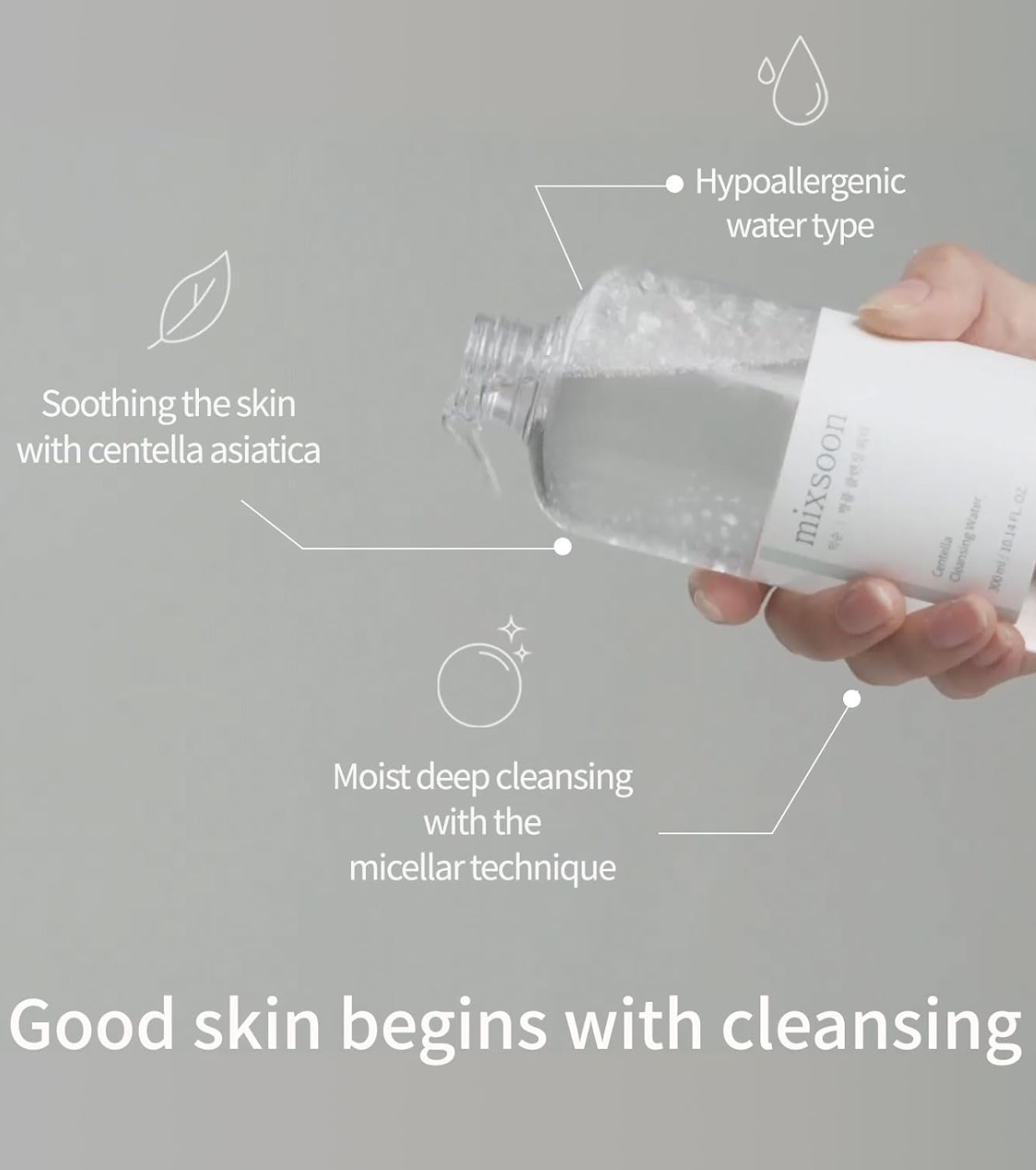 Descubra Mixsoon Centella Cleansing Water , uma água de limpeza suave e refrescante que remove eficazmente maquiagem, impurezas e excesso de oleosidade sem irritar ou ressecar a pele.